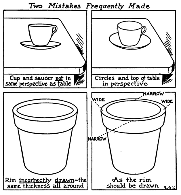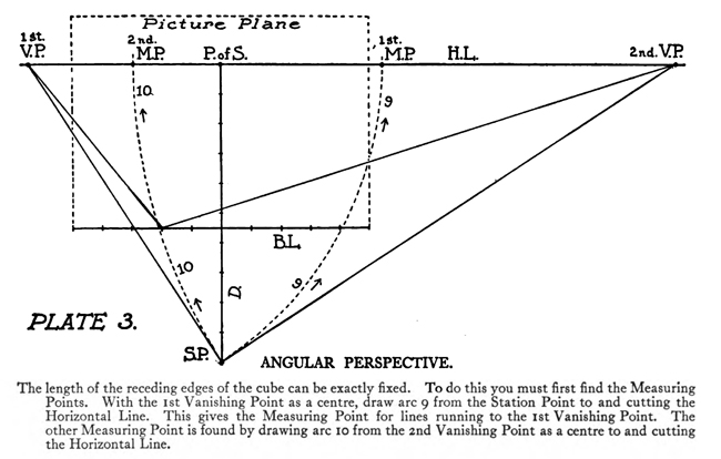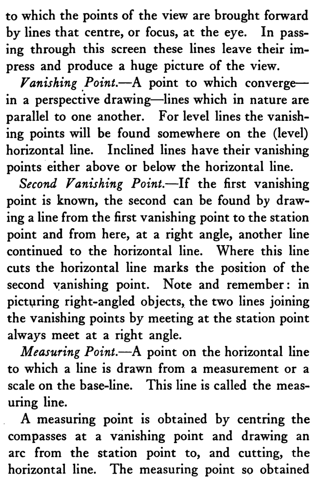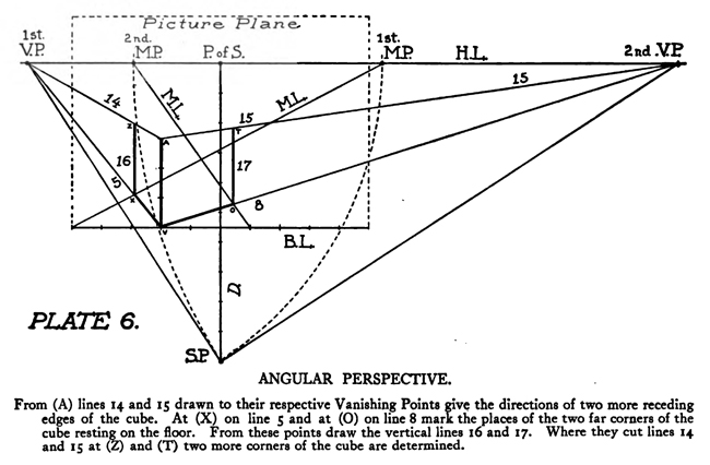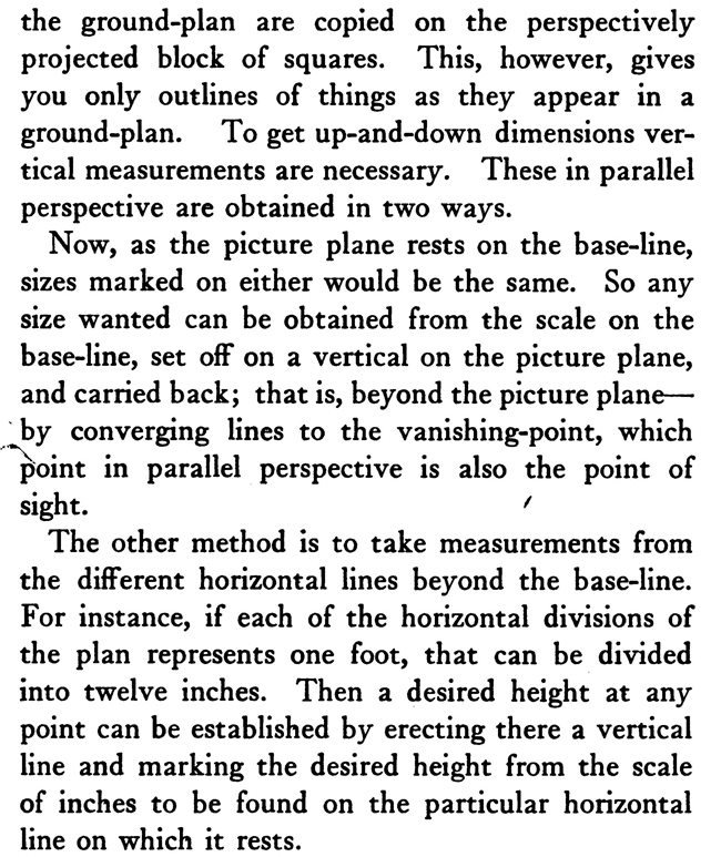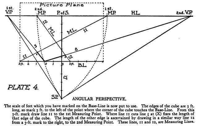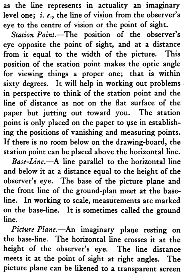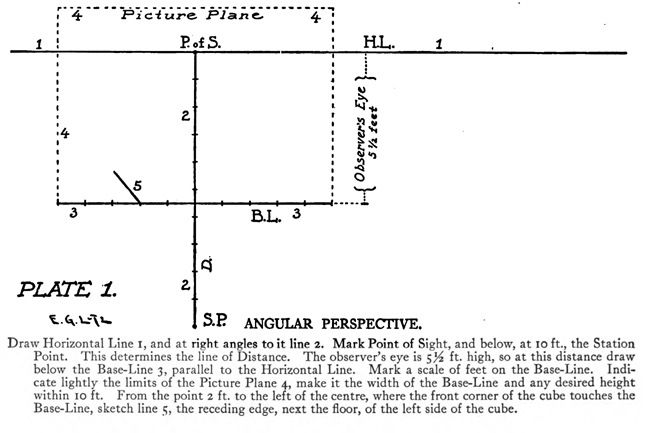 [The Text Above is Actually Images, so If You Need to Copy Text, You Can Do So Below] PERSPECTIVE/ MADE CLEARThe exemplification usually given in the introductory chapters of books on perspective is that of the window-pane on which the view outdoors is traced, or imagined as traced, perspectively. No simpler illustration than this can be given to make every one understand fully and vividly that that is the way the whole external world is perceived by the eye. The primitive artist did not depict things as he saw them; but as he palpably knew them. His knowledge of what things were, learned through sense and tangible apprehension, influenced him in his efforts at drawing. We look on his naive delineations, lacking perspective and light and shade, as nothing more than symbols. Perhaps to him, though, they were pictorially very realistic. The ancient Egyptians, if the pictures that they have left to us can be taken as a criterion, never realized that their eye was an optical instrument that reflected things perspectively. A pond bordered by plants and trees, drawn by an Egyptian artist was made as a map with the water conventionally shown in rows of zigzag lines. The bordering trees and plants looked as if they had been flattened out and pointed in the four directions of the compass. The two figures in the picture were drawn totally out of proportion to the rest of the composition. To indicate that there were growing aquatic plants, lotos blossoms were merely placed about. All to our eyes very decorative and symbolic, but to the ancient artist a faithful representation, perhaps, of the objects and view. The human figure was drawn in rather a queer way by the artists of ancient Egypt. It would be something like this: the legs and part of the body in profile, the shoulders twisted around to a front view, then the face in profile and the eye carefully outlined as it is seen in a full face view—all showing that he did not attempt to portray the figure as his eyes reflected it photographically. It would be hard to say whether he worked in his quaint way through lack of technical skill, disinclination, or non-realization of how objects and scenes actually looked to his eyes. The character of the drawing in the Pompeian wall-paintings shows that the artists of those times were beginning to notice that if they wanted to produce the semblance of reality in picturing solid angular things they must have certain lines slant, either downward or upward. But they did not seem to grasp the idea of conforming consistently to fixed vanishing points in the directions of these slanting lines. Then, too, the drawings of some modern Oriental artists betray in their simplicity ignorance of the elements of perspective. They have slanting lines to define their buildings and straight-edged solid objects; but the respective slanting lines do not go to vanishing points. Now, perspective could be easily comprehended if the external world, instead of being thought of as solid and material—which fact our tactile and mental faculties constantly remind us of—is in imagination projected forward and outlined on an ideal plane directly before our eyes. Doing this, considering the natural object you wish to draw as merely traced out on a supposed plane before you, is the first lesson in the study of perspective. The black-and-white draftsman is interested mainly in linear perspective. Curvilinear perspective is used in planning cycloramas, and aerial perspective is of interest to the landscape-painter and does not bring the question of lines into use, but concerns itself with differences of the tints and colors in a general view as they vary from the fore-. ground to the distance. The study and consideration of it help the artist in rendering correctly effects of atmosphere, space, and distance. Perspective Of linear perspective there are two kinds: parallel and angular. In the simpler of these, parallel, all the horizontal lines that are at right angles to the central visual ray, or the line of vision, are shown parallel; and the lines which in nature go in the same direction as the line of vision, in a perspective rendering recede toward a point on the horizon directly before the spectator's eye. A familiar example is that of a floor marked off into square feet with the crosswise lines parallel to the horizon. A view of a huge checker-board placed on the floor with one edge directly before you would do to illustrate it. A FANCIFUL ANALOGYMost drawings requiring pictorial projection are made in angular perspective. In this method the principal object is placed in such a way that some corner or angle points toward the observer and the lines bounding its edges converge obliquely toward vanishing points. The best way to make perspective clear is to give a particular example and show the way of procedure from the beginning and carried through to the end. You will find, then, illustrated in these pages, seven plates with explanations of a simple problem in angular perspective. It will be advisable, though, that perspective terms first be studied. TERMS USED IN PERSPECTIVEHorizontal Line.—A line on a level with the observer's eye, not always apparent. Visible in a view of the sea or the open flat country. Point of Sight.—A point on the horizontal line opposite the observer's eye. In parallel perspective this is also the vanishing point. It is sometimes called the centre of vision, or the centre of the picture. Distance.—The line marked in the drawing as running from the point of sight to the station point, or observer's eye, and measuring the principal distance. It will here be spoken of as the distance or the line of distance. This line is at right angles to the horizontal line and equal in length to the base-line or the width of the picture. When shorter, that is, bringing the observer's eye closer, the result will be a rendering of the objects in sharp-angled or violent perspective. This line is called by some the ver