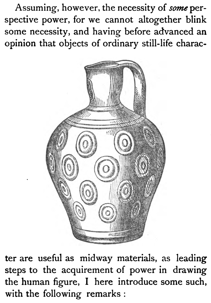 Assuming, however, the necessity of some perspective power, for we cannot altogether blink some necessity, and having before advanced an opinion that objects of ordinary still-life character are useful as midway materials, as leading steps to the acquirement of power in drawing the human figure, I here introduce some such, with the following remarks :
