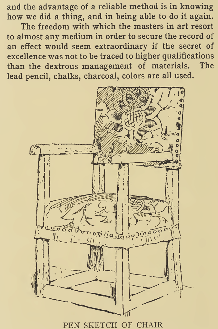 DRAWING LESSONS IN EASY SKETCHINGDrawing from nature compels the student to observe, to appreciate what he sees, and the act of drawing fixes the image clearly and permanently in his memory. As the eye becomes trained it picks out more and more unerringly the beautiful, but at first all things ought to have an interest. The student should proceed on the plan that he finds himself in a strange world where everything has the charm of novelty, and that sketches are to be considered artistic capital for future needs. Then even the ordinary utensils of daily use will have a new meaning to him. A wheelbarrow, for example, is a familiar object, but make a drawing of one from memory and compare it with an actual wheelbarrow. No further proof will be necessary to convince one that there is much to be learned even from the commonplace. The artist looks for " picture quality " in the things about him. The grandeur of a mountain he may ignore for a bit of barnyard, or the glorious sunset for the fire in a village smithy, because he has learned to discriminate between the things that are within the range of painting and those that are not. No matter how interesting or magnificent a view may be it does not necessarily follow that it is suitable to graphic art or can be produced with the means at our disposal. This fact is not generally appreciated. Graphic art deals with appearances, not with material truths. We know the kettle is made of copper, but to the painter a glint of light transforms it into burnished gold. The beginner who is too conscious of local color is likely to fall into error and paint what he thinks, not what he sees. Although blades of grass are green, a field of grass may appear yellow, violet, gray or some other color. The student should promptly learn to seek for character in the objects he undertakes to sketch. The new timbers under a wharf are probably stronger and better suited to support weight than those which they replaced, but the old ones were covered with moss and had " character " ; they were picturesque and artistically superior to the new ones. In sketching, first consider general appearances. Partially close the eyes, or squint, in order to see the masses without detail, and note the values. If this is all that you have time or opportunity to secure the sketch is worth preserving, for it will always serve as a reminder to the mental vision of something the eye has seen. The slightest memorandum may contain the happiest suggestion, and even written notes will recall to memory effects which otherwise might be forgotten. A helpful and permissible way of getting proportions is to hold the pencil at arm's length, in line with the subject to be sketched, and run the thumb up and down on it until the distance between the end of the pencil and the thumb coincides with the space seen between two points in the model, as, for instance, the height of a door. Still keeping the arm at full length, turn the pencil around and find another measurement to equal the first, say from the edge of the door to the window. Half the height of the window is equal to the width of the door, and so on. As there are skeletons in live creatures, so in an artistic sense there are skeletons to inanimate things. A landscape has its skeleton —a tree or a building. And while correctness of drawing is to be the artist's ultimate object, the surest way to secure it is by knowing the underlying principles of construction. Facility in sketching cannot be gained by imitating another's work. If it were possible to acquire the impulse, knowledge and certainty of the master hand by copying, teaching art would be a very simple matter, but the power by which good works are produced must be sought for in adequate experience and consequent skill acquired. Do not make your problems difficult ; the complex are not the most interesting —often the reverse. A gate post may have in it sufficient variety of light and shade to claim your best attention. On the weather-beaten surface of a barn door nature may produce a symphony in color. It is for you to discover her charms and interpret them for the benefit of others. That is the mission of the artist. When we remember that nothing we do can be undone or effaced, it behooves the student to be deliberate, careful and serious in his work. Purposeless daubing with a brush or scratching with a pen is a step backward. Wasted time cannot be recovered, and the dissipation of energy is debasing and enervating to the faculties. Self-discipline is the hardest and at the same time the most important task that the student faces. Sketching in water colors is not advised for the beginner, for the reason that the attention is diverted by the uncertain nature of the medium. It is usually the accidental blending of washes which makes a water color drawing interesting, but for serious study the pupil should not resort to it, at least until he knows how to paint and draw with exactness. A careful pen or pencil sketch with written descriptions of the color effects, which afterward may be translated with the oil colors or chalks, will answer every purpose. Pastels or colored chalks are admirably suited for sketching. Rough paper is used and the colors are gently blended, or " rubbed in " with the fingers. Great care must be exercised, so that the color does not brush off, however, as there is no way of " fixing " pastels. These chalks come in every tint and shade and any one can use them without special instruction. It is with some reluctance that instantaneous photographs are admitted to be of help to the artist, because the student is prone to place too much reliance upon them, and to forget that sure knowledge only comes in the actual drawing from nature. In the hands of one who has already learned to draw, to paint, to select, they may be resorted to as an expedient to obtain realism in figures with action, but it should be remembered that the instantaneous photograph does not satisfy 