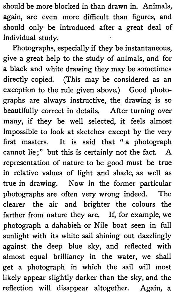 After turning over many, if they be well selected, it feels almost impossible to look at sketches except by the very first masters. It is said that " a photograph cannot lie;" but this is certainly not the fact. A representation of nature to be good must be true in relative values of light and shade, as well as true in drawing. Now in the former particular photographs are often very wrong indeed. The clearer the air and brighter the colours the farther from nature they are. If, for example, we photograph a dahabieh or Nile boat seen in full sunlight with its white sail shining out dazzlingly against the deep blue sky, and reflected with almost equal brilliancy in the water, we shall get a photograph in which the sail will most likely appear slightly darker than the sky, and the reflection will disappear altogether.