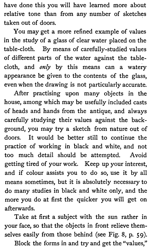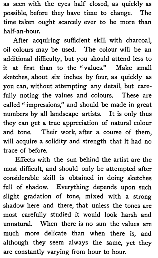 Block the forms in and try and get the "values," as seen with the eyes half closed, as quickly as possible, before they have time to change. The time taken ought scarcely ever to be more than half-an-hour.