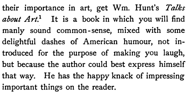 If you desire to learn more about values and their importance in art, get Wm. Hunt's Talks about Art.' It is a book in which you will find manly sound common-sense, mixed with some delightful dashes of American humour, not introduced for the purpose of making you laugh, but because the author could best express himself that way. He has the happy knack of impressing important things on the reader.