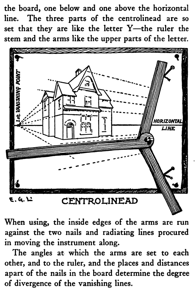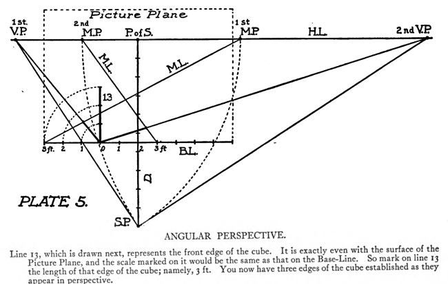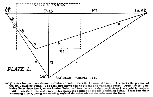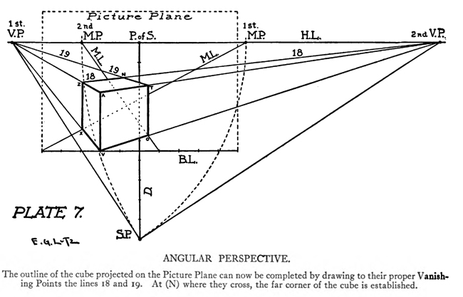 [The Text Above is Actually Images, so If You Need to Copy Text, You Can Do So Below] PERSPECTIVE/ MADE CLEARThe exemplification usually given in the introductory chapters of books on perspective is that of the window-pane on which the view outdoors is traced, or imagined as traced, perspectively. No simpler illustration than this can be given to make every one understand fully and vividly that that is the way the whole external world is perceived by the eye. The primitive artist did not depict things as he saw them; but as he palpably knew them. His knowledge of what things were, learned through sense and tangible apprehension, influenced him in his efforts at drawing. We look on his naive delineations, lacking perspective and light and shade, as nothing more than symbols. Perhaps to him, though, they were pictorially very realistic. The ancient Egyptians, if the pictures that they have left to us can be taken as a criterion, never realized that their eye was an optical instrument that reflected things perspectively. A pond bordered by plants and trees, drawn by an Egyptian artist was made as a map with the water conventionally shown in rows of zigzag lines. The bordering trees and plants looked as if they had been flattened out and pointed in the four directions of the compass. The two figures in the picture were drawn totally out of proportion to the rest of the composition. To indicate that there were growing aquatic plants, lotos blossoms were merely placed about. All to our eyes very decorative and symbolic, but to the ancient artist a faithful representation, perhaps, of the objects and view. The human figure was drawn in rather a queer way by the artists of ancient Egypt. It would be something like this: the legs and part of the body in profile, the shoulders twisted around to a front view, then the face in profile and the eye carefully outlined as it is seen in a full face view—all showing that he did not attempt to portray the figure as his eyes reflected it photographically. It would be hard to say whether he worked in his quaint way through lack of technical skill, disinclination, or non-realization of how objects and scenes actually looked to his eyes. The character of the drawing in the Pompeian wall-paintings shows that the artists of those times were beginning to notice that if they wanted to produce the semblance of reality in picturing solid angular things they must have certain lines slant, either downward or upward. But they did not seem to grasp the idea of conforming consistently to fixed vanishing points in the directions of these slanting lines. Then, too, the drawings of some modern Oriental artists betray in their simplicity ignorance of the elements of perspective. They have slanting lines to define their buildings and straight-edged solid objects; but the respective slanting lines do not go to vanishing points. Now, perspective could be easily comprehended if the external world, instead of being thought of as solid and material—which fact our tactile and mental faculties constantly remind us of—is in imagination projected forward and outlined on an ideal plane directly before our eyes. Doing this, considering the natural object you wish to draw as merely traced out on a supposed plane before you, is the first lesson in the study of perspective. The black-and-white draftsman is interested mainly in linear perspective. Curvilinear perspective is used in planning cycloramas, and aerial perspective is of interest to the landscape-painter and does not bring the question of lines into use, but concerns itself with differences of the tints and colors in a general view as they vary from the fore-. ground to the distance. The study and consideration of it help the artist in rendering correctly effects of atmosphere, space, and distance. Perspective Of linear perspective there are two kinds: parallel and angular. In the simpler of these, parallel, all the horizontal lines that are at right angles to the central visual ray, or the line of vision, are shown parallel; and the lines which in nature go in the same direction as the line of vision, in a perspective rendering recede toward a point on the horizon directly before the spectator's eye. A familiar example is that of a floor marked off into square feet with the crosswise lines parallel to the horizon. A view of a huge checker-board placed on the floor with one edge directly before you would do to illustrate it. A FANCIFUL ANALOGYMost drawings requiring pictorial projection are made in angular perspective. In this method the principal object is placed in such a way that some corner or angle points toward the observer and the lines bounding its edges converge obliquely toward vanishing points. The best way to make perspective clear is to give a particular example and show the way of procedure from the beginning and carried through to the end. You will find, then, illustrated in these pages, seven plates with explanations of a simple problem in angular perspective. It will be advisable, though, that perspective terms first be studied. TERMS USED IN PERSPECTIVEHorizontal Line.—A line on a level with the observer's eye, not always apparent. Visible in a view of the sea or the open flat country. Point of Sight.—A point on the horizontal line opposite the observer's eye. In parallel perspective this is also the vanishing point. It is sometimes called the centre of vision, or the centre of the picture. Distance.—The line marked in the drawing as running from the point of sight to the station point, or observer's eye, and measuring the principal distance. It will here be spoken of as the distance or the line of distance. This line is at right angles to the horizontal line and equal in length to the base-line or the width of the picture. When shorter, that is, bringing the observer's eye closer, the result will be a rendering of the objects in sharp-angled or violent perspective. This line is called by some the ver