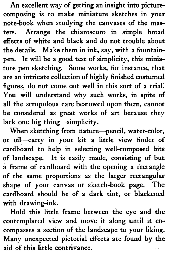 An excellent way of getting an insight into picture-composing is to make miniature sketches in your note-book when studying the canvases of the masters. Arrange the chiaroscuro in simple broad effects of white and black and do not trouble about the details. Make them in ink, say, with a fountain-pen. It will be a good test of simplicity, this miniature pen sketching. Some works, for instance, that are an intricate collection of highly finished costumed figures, do not come out well in this sort of a trial. You will understand why such works, in spite of all the scrupulous care bestowed upon them, cannot be considered as great works of art because they lack one big thing—simplicity. When sketching from nature—pencil, water-color, or oil—carry in your kit a little view finder of cardboard to help in selecting well-composed bits of landscape. It is easily made, consisting of but a frame of cardboard with the opening a rectangle of the same proportions as the larger rectangular shape of your canvas or sketch-book page. The cardboard should be of a dark tint, or blackened with drawing-ink. Hold this little frame between the eye and the contemplated view and move it along until it encompasses a section of the landscape to your liking. Many unexpected pictorial effects are found by the aid of this little contrivance. The use of this view-finder also enables the sketcher to fix the place of an important item in a landscape: namely, the horizon. In a landscape sketch the horizon should either be above or below the middle of the picture. That is, the particular shape that you have decided on for the picture must not be divided into two equal parts by the horizon. According to some artists, every landscape, to be considered as artistically put together, should have these three planes, not necessarily obviously, but discernibly on analysis, marked : (I) Foreground, (z) middle ground, (3) distance. |