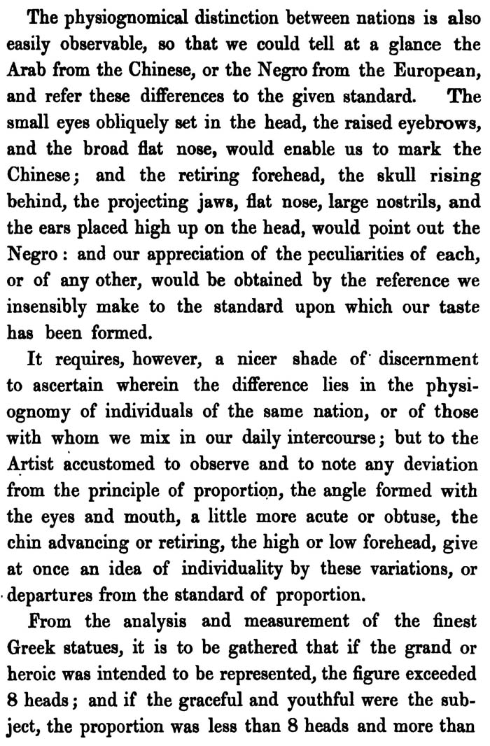 The physiognomical distinction between nations is also easily observable, so that we could tell at a glance the Arab from the Chinese, or the Negro from the European, and refer these differences to the given standard. The small eyes obliquely set in the head, the raised eyebrows, and the broad flat nose, would enable us to mark the Chinese; and the retiring forehead, the skull rising behind, the projecting jaws, flat nose, large nostrils, and the ears placed high up on the head, would point out the Negro : and our appreciation of the peculiarities of each, or of any other, would be obtained by the reference we insensibly make to the standard upon which our taste has been formed.