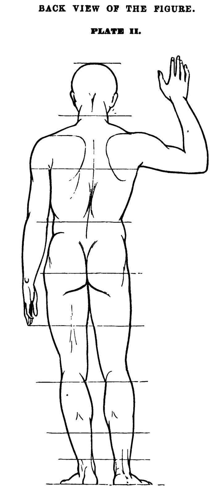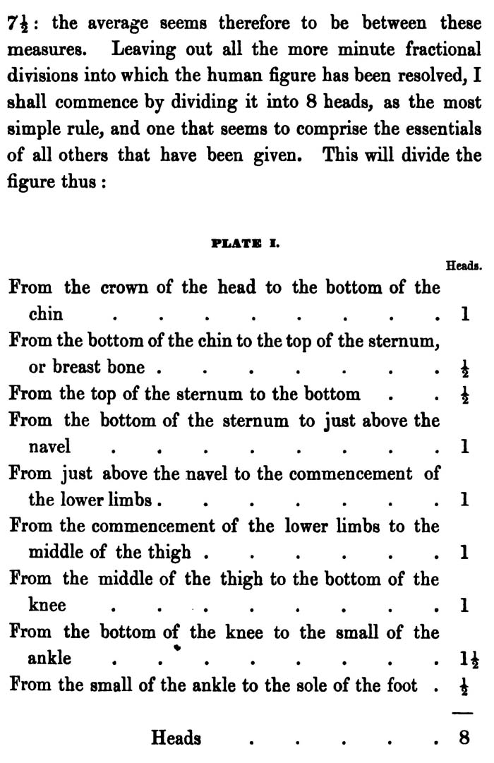 From the analysis and measurement of the finest Greek statues, it is to be gathered that if the grand or heroic was intended to be represented, the figure exceeded 8 heads ; and if the graceful and youthful were the subject, the proportion was less than 8 heads and more than 71 : the average seems therefore to be between these measures. Leaving out all the more minute fractional divisions into which the human figure has been resolved, I shall commence by dividing it into 8 heads, as the most simple rule, and one that seems to comprise the essentials of all others that have been given. This will divide the figure thus :