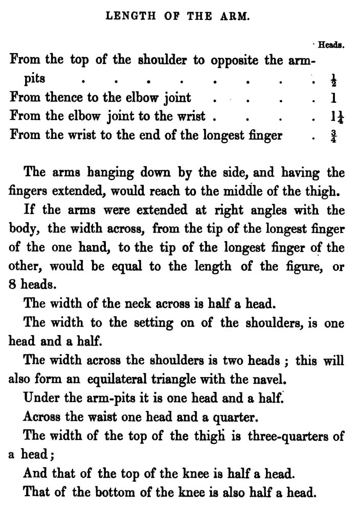 If the arms were extended at right angles with the body, the width across, from the tip of the longest finger of the one hand, to the tip of the longest finger of the other, would be equal to the length of the figure, or 8 heads.