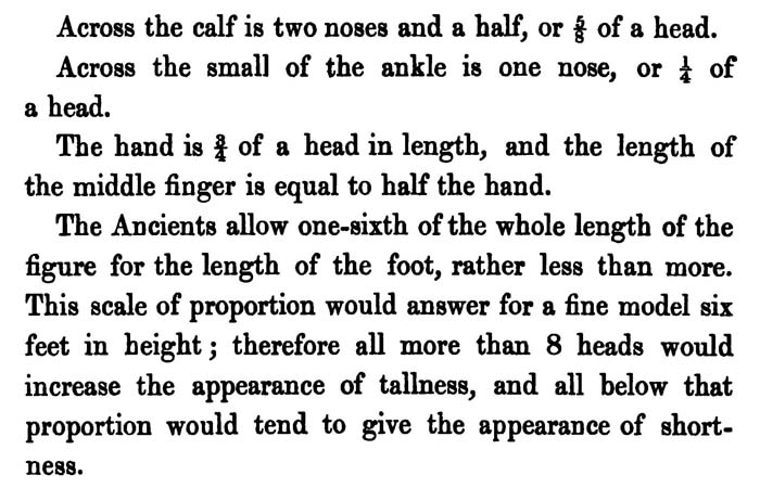The Ancients allow one-sixth of the whole length of the figure for the length of the foot, rather less than more. This scale of proportion would answer for a fine model six feet in height ; therefore all more than 8 heads would increase the appearance of tallness, and all below that proportion would tend to give the appearance of shortness.