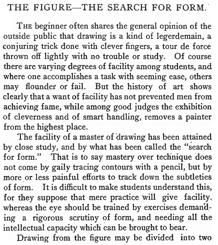 The beginner often shares the general opinion of the outside public that drawing is a kind of legerdemain, a conjuring trick done with clever fingers, a tour de force thrown off lightly with no trouble or study. Of course there are varying degrees of facility among students, and where one accomplishes a task with seeming ease, others may flounder or fail. But the history of art shows clearly that a want of facility has not prevented men from achieving fame, while among good judges the exhibition of cleverness and of smart handling, removes a painter from the highest place.