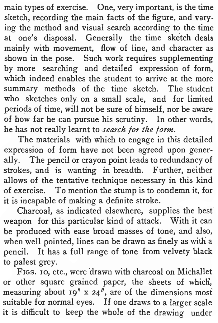 Drawing from the figure may be divided into two main types of exercise. One, very important, is the time sketch, recording the main facts of the figure, and varying the method and visual search according to the time at one's disposal. Generally the time sketch deals mainly with movement, flow of line, and character as shown in the pose. Such work requires supplementing by more searching and detailed expression of form, which indeed enables the student to arrive at the more summary methods of the time sketch. The student who sketches only on a small scale, and for limited periods of time, will not be sure of himself, nor be aware of how far he can pursue his scrutiny. In other words, he has not really learnt to-search for the form.