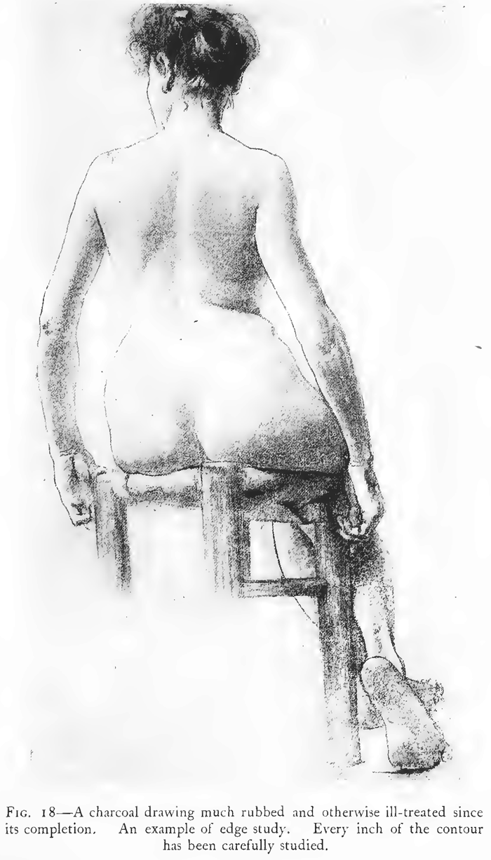FIGS. 10, etc., were 'drawn with charcoal on Michallet or other square grained paper, the sheets of which, measuring about 19" x 24", are of the dimensions most suitable for normal eyes. If one draws to a larger scale it is difficult to keep the whole of the drawing under surveillance, and errors in proportion, and in gradation of accent, are apt to occur. Even if drawings, say for a large mural decoration, were wanted, they should be drawn first to this scale, and then enlarged by squaring or other method. There are some life drawings by Albert Moore, at South Kensington, drawn full size or nearly so, but the method does not seem to possess compensating advantages.