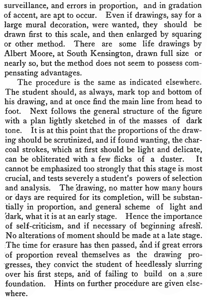 The procedure is the same as indicated elsewhere. The student should, as always, mark top and bottom of his drawing, and at once find the main line from head to foot. Next follows the general structure of the figure with a plan lightly sketched in of the masses of dark tone. It is at this point that the proportions of the drawing should be scrutinized, and if found wanting, the charcoal strokes, which at first should be light and delicate, can be obliterated with a few flicks of a duster. It cannot be emphasized too strongly that this stage is most crucial, and tests severely a student's powers of selection and analysis. The drawing, no matter how many hours or days are required for its completion, will be substantially in proportion, and general scheme of light and 'dark, what it is at an early stage. Hence the importance of self-criticism, and if necessary of beginning afresh'. No alterations of moment should be made at a late stage. The time for erasure has then passed, and if great errors of proportion reveal themselves as the drawing progresses, they convict the student of heedlessly slurring over his first steps, and of failing to build on a sure foundation. Hints on further procedure are given elsewhere.