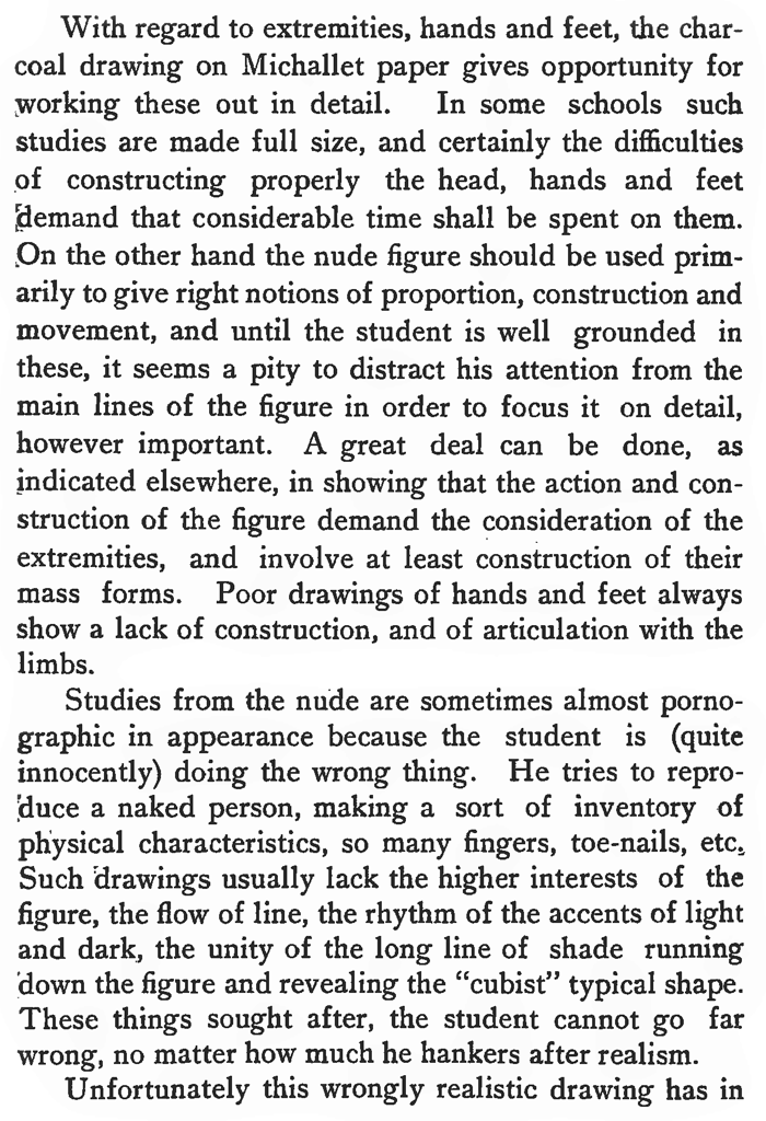 Studies from the nude are sometimes almost pornographic in appearance because the student is (quite innocently) doing the wrong thing. He tries to reproduce a naked person, making a sort of inventory of physical characteristics, so many fingers, toe-nails, etc, Such drawings usually lack the higher interests of the figure, the flow of line, the rhythm of the accents of light and dark, the unity of the long line of shade running down the figure and revealing the "cubist" typical shape. These things sought after, the student cannot go far wrong, no matter how much he hankers after realism.