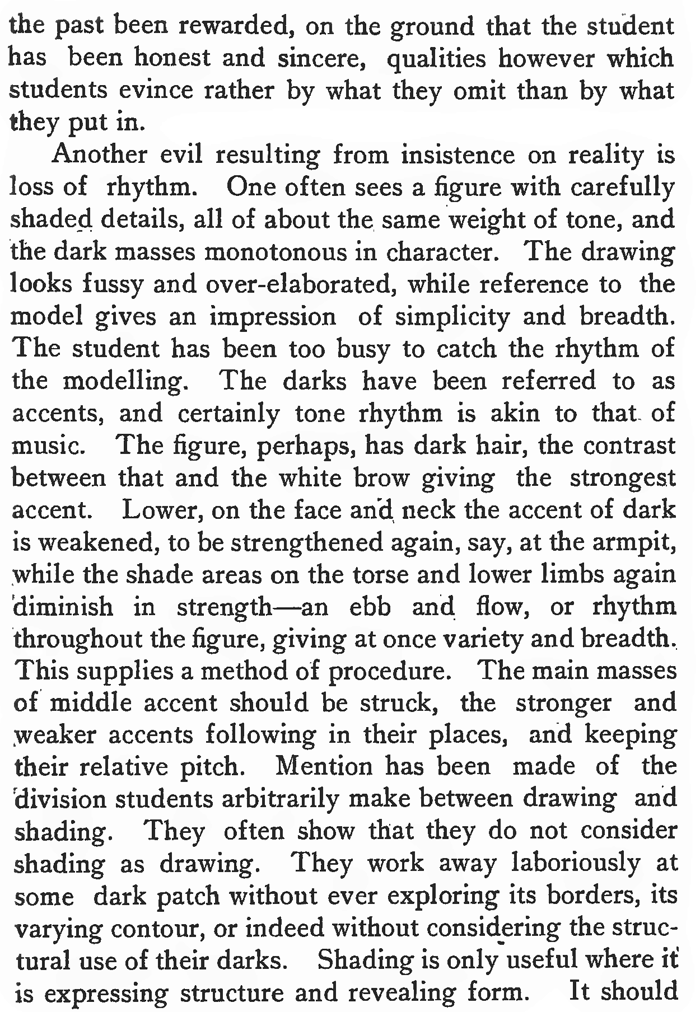 Another evil resulting from insistence on reality is loss of rhythm. One often sees a figure with carefully shaded details, all of about the, same weight of tone, and the dark masses monotonous in character. The drawing looks fussy and over-elaborated, while reference to the model gives an impression of simplicity and breadth. The student has been too busy to catch the rhythm of the modeling. The darks have been referred to as accents, and certainly tone rhythm is akin to that, of music. The figure, perhaps, has dark hair, the contrast between that and the white brow giving the strongest accent. Lower, on the face add, neck the accent of dark is weakened, to be strengthened again, say, at the armpit, while the shade areas on the torso and lower limbs again diminish in strength—an ebb and flow, or rhythm throughout the figure, giving at once variety and breadth.. This supplies a method of procedure. The main masses of middle accent should be struck, the stronger and weaker accents following in their places, and keeping their relative pitch. Mention has been made of the 'division students arbitrarily make between drawing and shading. They often show that they do not consider shading as drawing. They work away laboriously at some dark patch without ever exploring its borders, its varying contour, or indeed without considering the structural use of their darks. Shading is only useful where if is expressing structure and revealing form. It should be busy, that is giving due emphasis to the line of shade which emphasizes the meeting of the planes.
