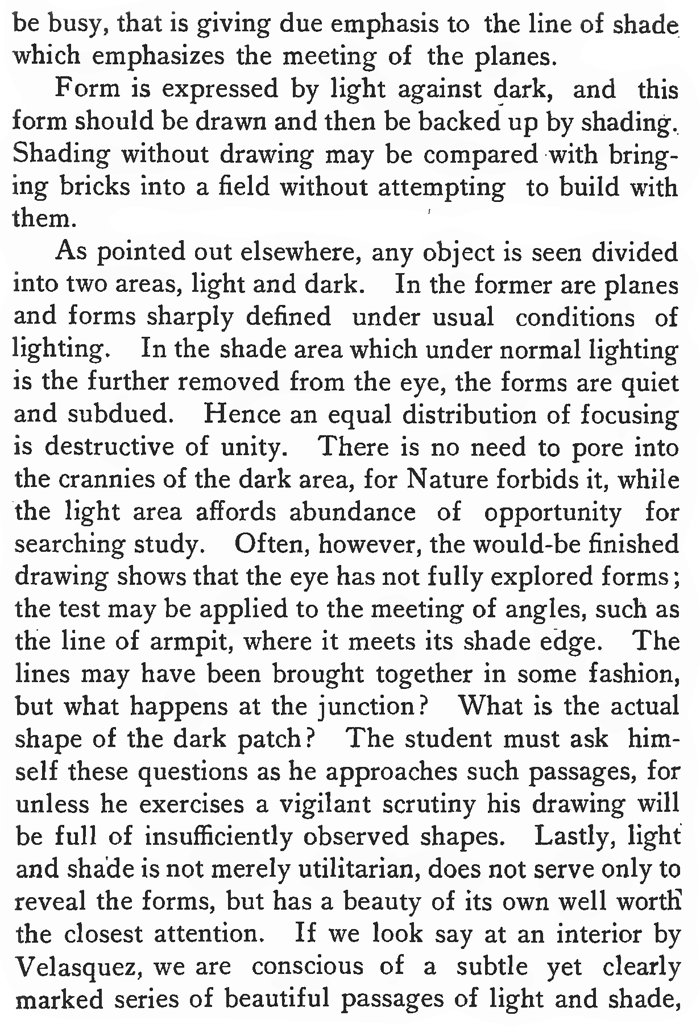 Form is expressed by light against dark, and this form should be drawn and then be backed up by shading. Shading without drawing may be compared with bringing bricks into a field without attempting to build with them.