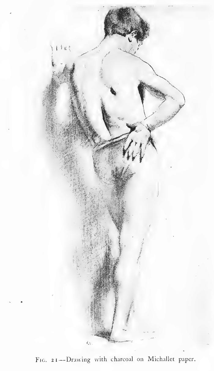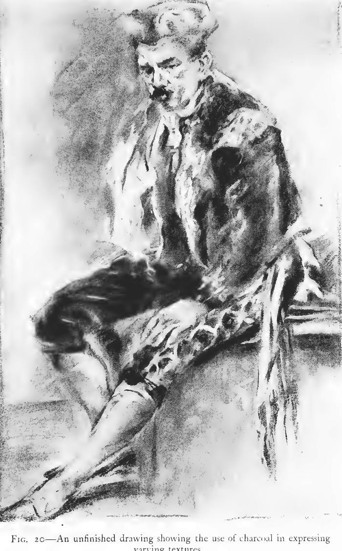Charcoal, as indicated elsewhere, supplies the best weapon for this particular kind of attack. With it can be produced with ease broad masses of tone, and also, when well pointed, lines can be drawn as finely as with a pencil. It has a full range of tone from velvety black to palest gray.