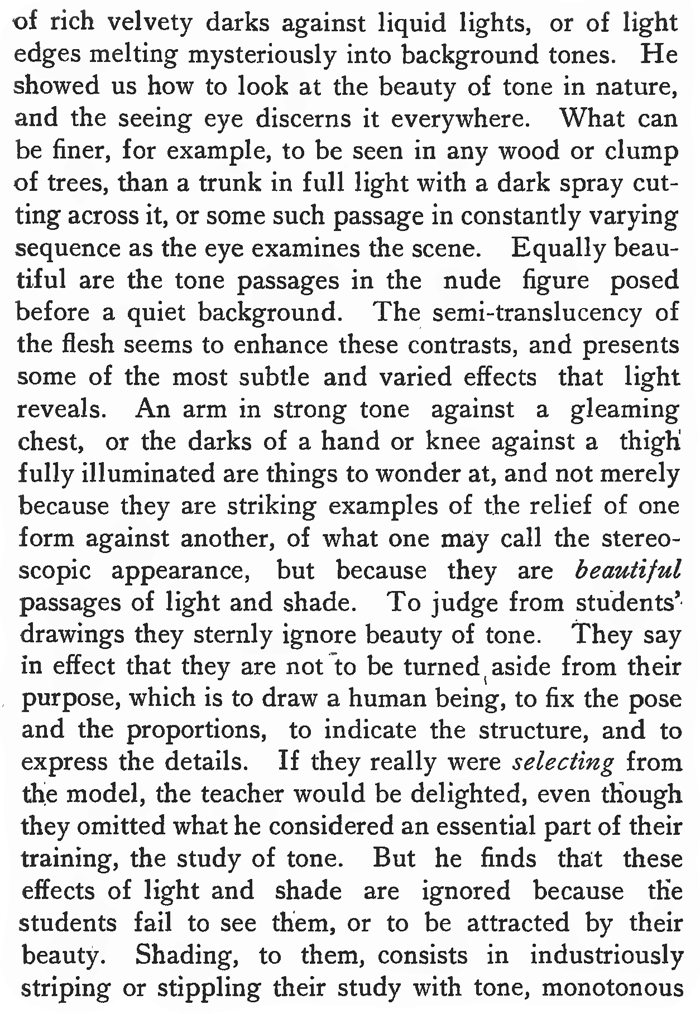 As pointed out elsewhere, any object is seen divided into two areas, light and dark. In the former are planes and forms sharply defined under usual conditions of lighting. In the shade area which under normal lighting is the further removed from the eye, the forms are quiet and subdued. Hence an equal distribution of focusing is destructive of unity. There is no need to pore into the crannies of the dark area, for Nature forbids it, while the light area affords abundance of opportunity for searching study. Often, however, the would-be finished drawing shows that the eye has not fully explored forms ; the test may be applied to the meeting of angles, such as the line of armpit, where it meets its shade edge. The lines may have been brought together in some fashion, but what happens at the junction? What is the actual shape of the dark patch ? The student must ask himself these questions as he approaches such passages, for unless he exercises a vigilant scrutiny his drawing will be full of insufficiently observed shapes. Lastly, light and shade is not merely utilitarian, does not serve only to reveal the forms, but has a beauty of its own well worth the closest attention. If we look say at an interior by Velasquez, we are conscious of a subtle yet clearly marked series of beautiful passages of light and shade, of rich velvety darks against liquid lights, or of light edges melting mysteriously into background tones. He showed us how to look at the beauty of tone in nature, and the seeing eye discerns it everywhere. What can be finer, for example, to be seen in any wood or clump of trees, than a trunk in full light with a dark spray cutting across it, or some such passage in constantly varying sequence as the eye examines the scene. Equally beautiful are the tone passages in the nude figure posed before a quiet background. The semi-translucency of the flesh seems to enhance these contrasts, and presents some of the most subtle and varied effects that light reveals. An arm in strong tone against a gleaming chest, or the darks of a hand or knee against a thigh fully illuminated are things to wonder at, and not merely because they are striking examples of the relief of one form against another, of what one may call the stereoscopic appearance, but because they are beautiful passages of light and shade. To judge from students'• drawings they sternly ignore beauty of tone. They say in effect that they are not to be turned, aside from their purpose, which is to draw a human being, to fix the pose and the proportions, to indicate the structure, and to express the details. If they really were selecting from the model, the teacher would be delighted, even though they omitted what he considered an essential part of their training, the study of tone. But he finds that these effects of light and shade are ignored because the students fail to see them, or to be attracted by their beauty. Shading, to them, consists in industriously striping or stippling their study with tone, monotonous yet full of the wrong variety—too many lights in the dark areas, and too many darks in the light—while their shading has often no drawing in it; they fail to follow the boundary of the shade patch, nor do they give the variety of its edge, for they do not perceive the "invisible" spots, the places where the outline melts away, nor, on the other hand, the trenchant, brilliant edge where a dark comes sharply against the light, or where the contour of the figure in light contrasts with the darker background.