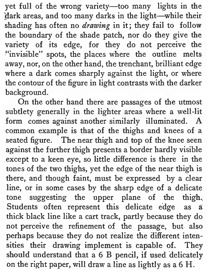 On the other hand there are passages of the utmost subtlety generally in the lighter areas where a well-lit form comes against another similarly illuminated. A common example is that of the thighs and knees of a seated figure. The near thigh and top of the knee seen against the further thigh presents a border hardly visible except to a keen eye, so little difference is there in the tones of the two thighs, yet the edge of the near thigh is there, and though faint, must be expressed by a clear line, or in some cases by the sharp edge of a delicate tone suggesting the upper plane of the thigh. Students often represent this delicate edge as a thick black line like a cart track, partly because they do not perceive the refinement of the passage, but also perhaps because they do not realize the different intensities their drawing implement is capable of. They should understand that a 6 B pencil, if used delicately on the right paper, will draw a line as lightly as a 6 H.