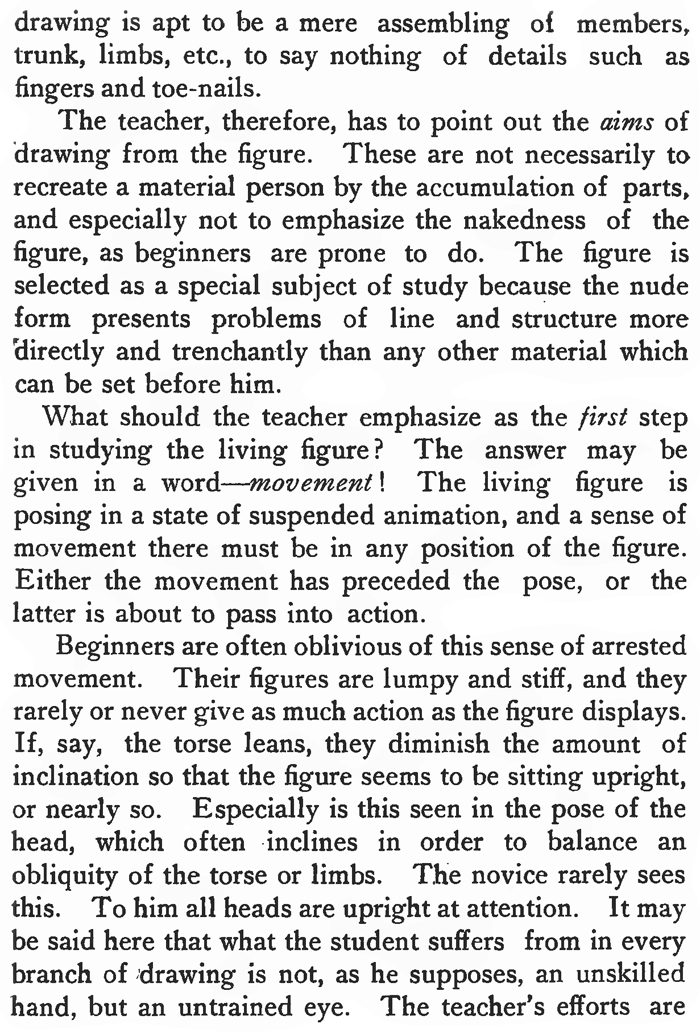 The teacher, therefore, has to point out the aims of drawing from the figure. These are not necessarily to recreate a material person by the accumulation of parts, and especially not to emphasize the nakedness of the figure, as beginners are prone to do. The figure is selected as a special subject of study because the nude form presents problems of line and structure more 'directly and trenchantly than any other material which can be set before him.