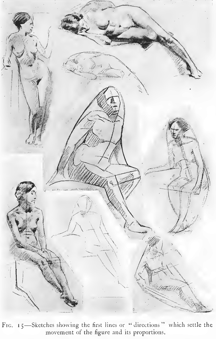 FIG. 16—Sketches showing the first lines or " directions" which settle the movement of the figure and its proportions.