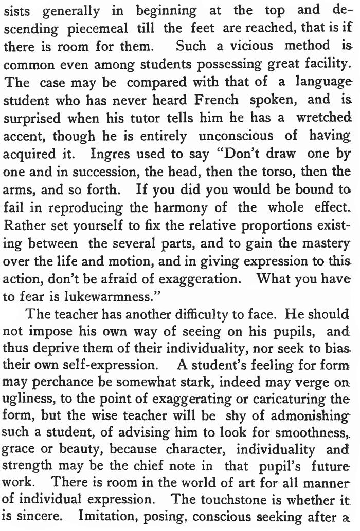 The teacher has another difficulty to face. He should not impose his own way of seeing on his pupils, and thus deprive them of their individuality, nor seek to bias their own self-expression. A student's feeling for form may perchance be somewhat stark, indeed may verge on ugliness, to the point of exaggerating or caricaturing the form, but the wise teacher will be shy of admonishing-such a student, of advising him to look for smoothness,. grace or beauty, because character, individuality and strength may be the chief note in that pupil's future work. There is room in the world of art for all manner of individual expression. The touchstone is whether it is sincere. Imitation, posing, conscious seeking after a style on the part of students cannot be too loudly condemned.