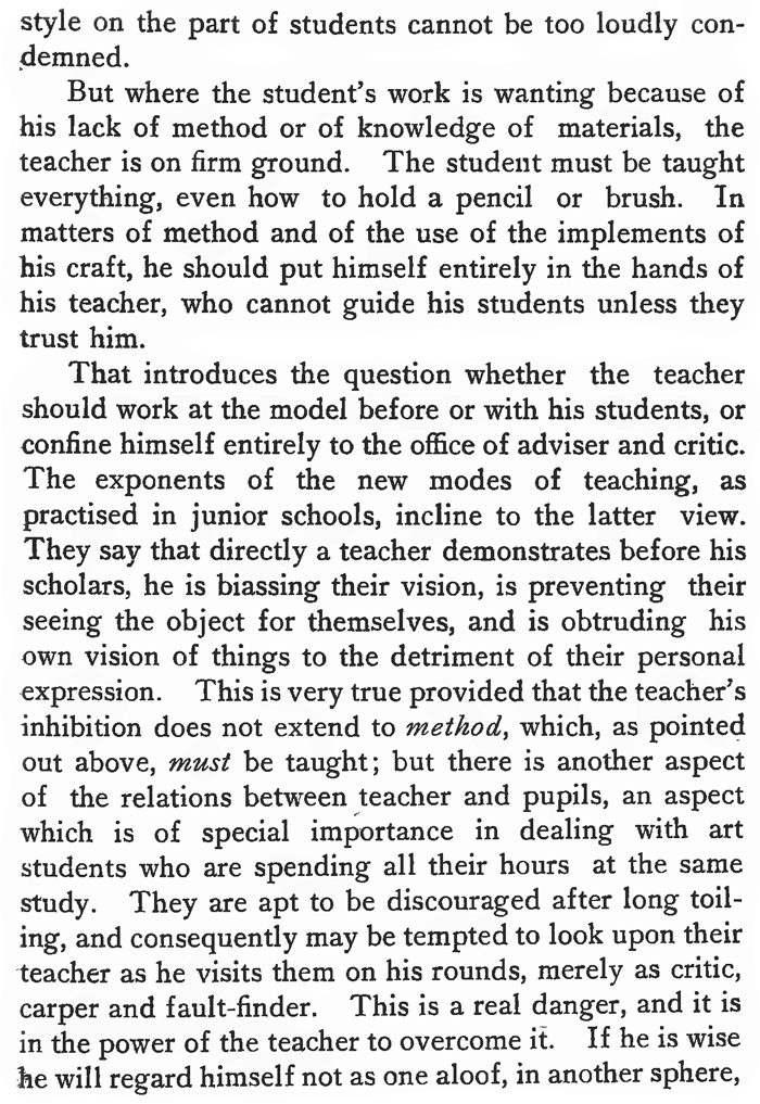 But where the student's work is wanting because of his lack of method or of knowledge of materials, the teacher is on firm ground. The student must be taught everything, even how to hold a pencil or brush. In matters of method and of the use of the implements of his craft, he should put himself entirely in the hands of his teacher, who cannot guide his students unless they trust him.