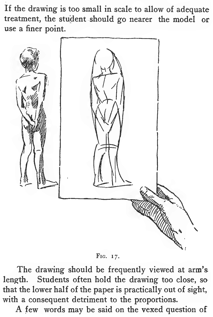 The drawing should be frequently viewed at arm's length. Students often hold the drawing too close, say that the lower half of the paper is practically out of sight, with a consequent detriment to the proportions.