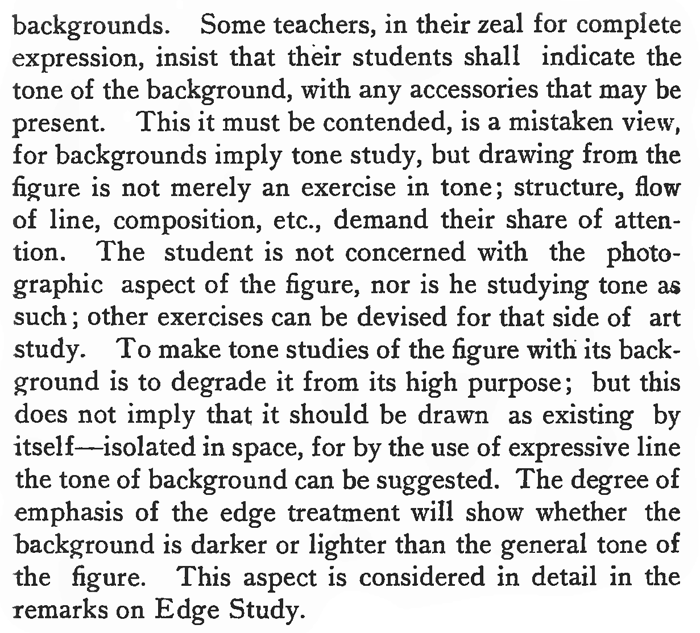 A few words may be said on the vexed question of backgrounds. Some teachers, in their zeal for complete expression, insist that their students shall indicate the tone of the background, with any accessories that may be present. This it must be contended, is a mistaken view, for backgrounds imply tone study, but drawing from the figure is not merely an exercise in tone; structure, flow of line, composition, etc., demand their share of attention. The student is not concerned with the photographic aspect of the figure, nor is he studying tone as such; other exercises can be devised for that side of art study. To make tone studies of the figure with its background is to degrade it from its high purpose; but this does not imply that it should be drawn as existing by itself—isolated in space, for by the use of expressive line the tone of background can be suggested. The degree of emphasis of the edge treatment will show whether the background is darker or lighter than the general tone of the figure. This aspect is considered in detail in the remarks on Edge Study.