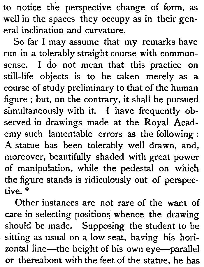 So far I may assume that my remarks have run in a tolerably straight course with commonsense. I do not mean that this practice on still-life objects is to be taken merely as a course of study preliminary to that of the human figure ; but, on the contrary, it shall be pursued simultaneously with it. I have frequently observed in drawings made at the Royal Academy such lamentable errors as the following : A statue has been tolerably well drawn, and, moreover, beautifully shaded with great power of manipulation, while the pedestal on which the figure stands is ridiculously out of perspective. *