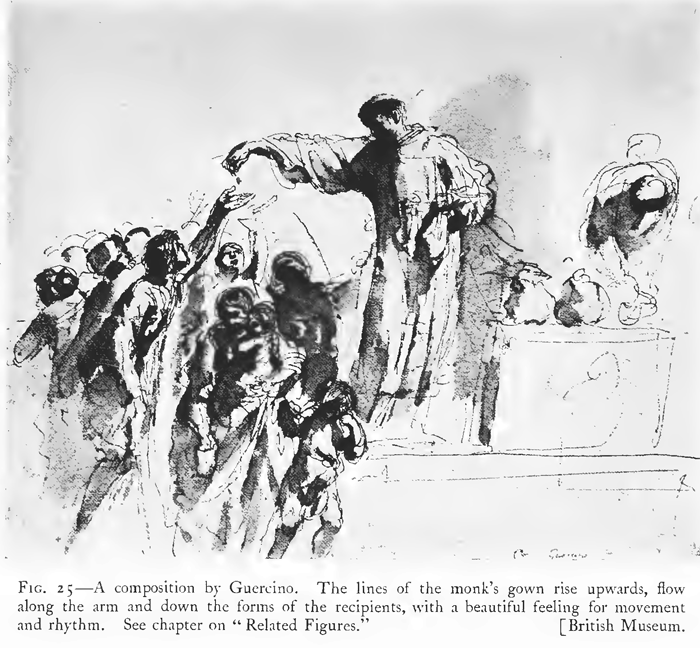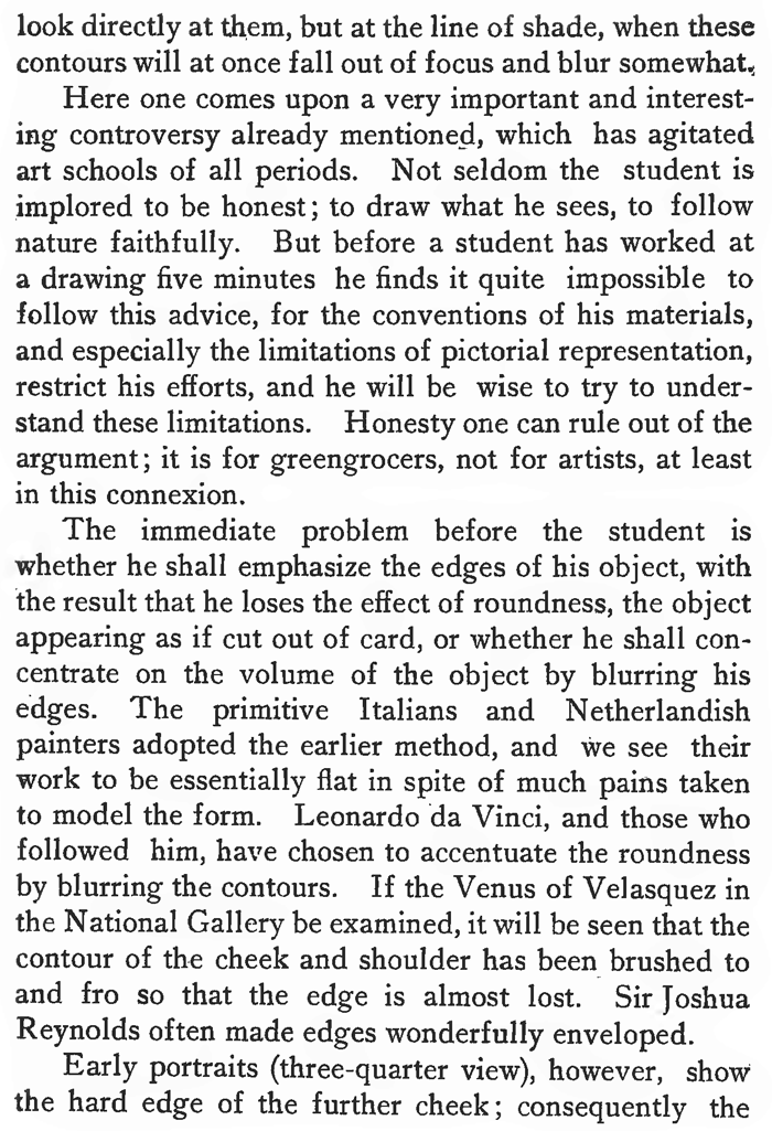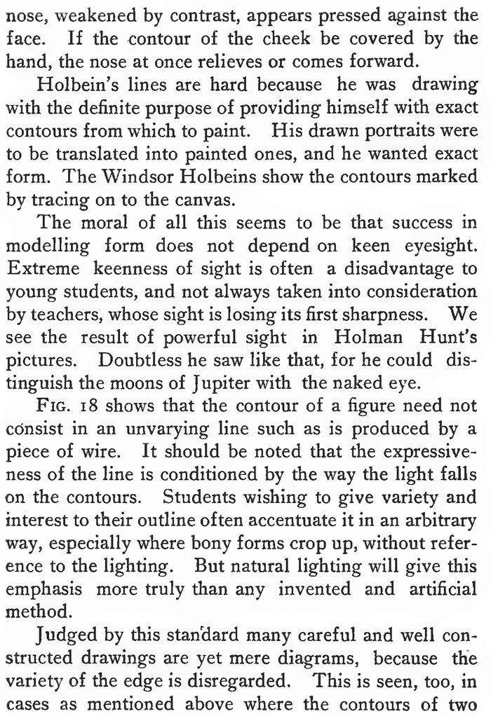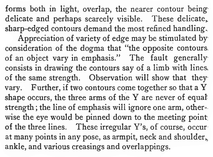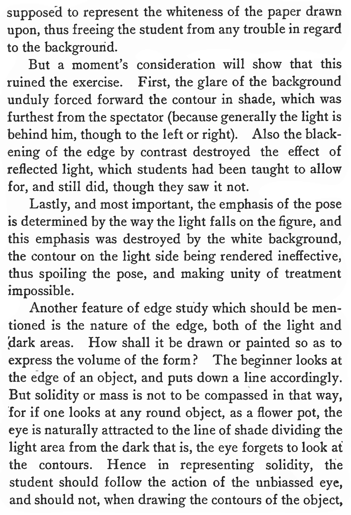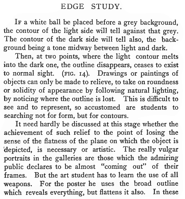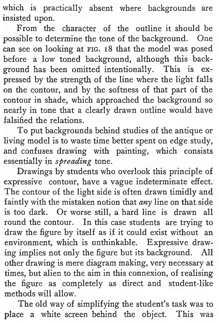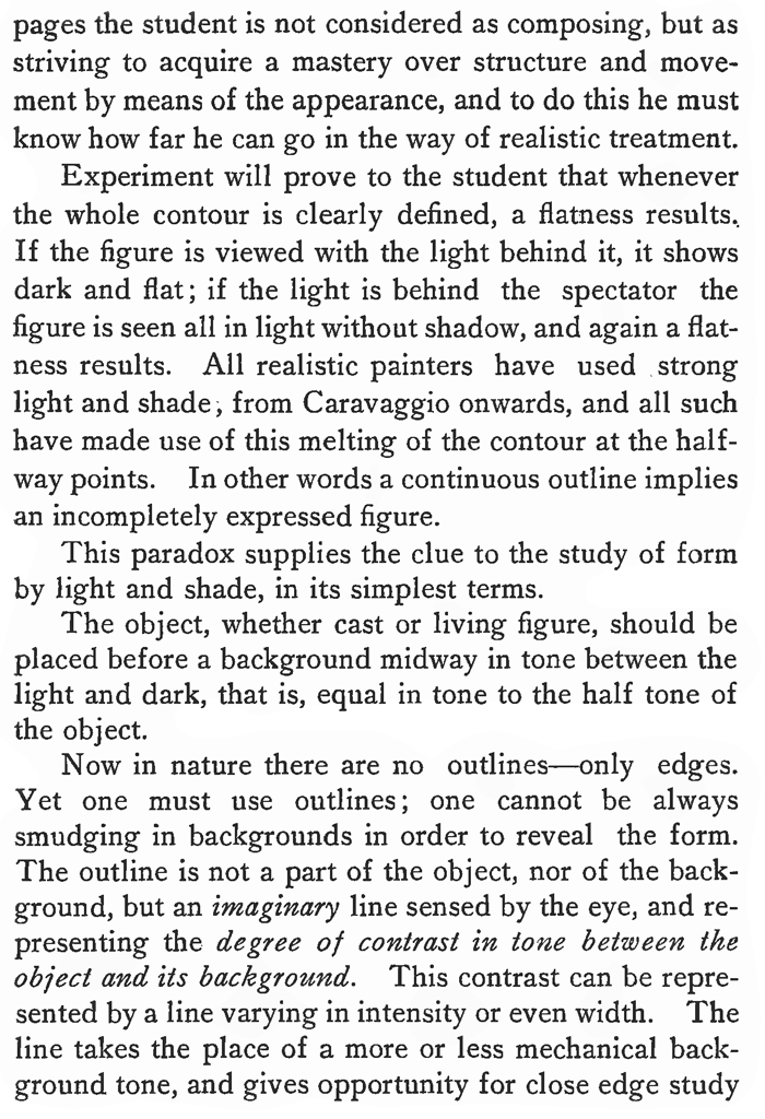 The Text Above is Actually Images, the text is below if you need to copy some of it. EDGE STUDY : Drawing the Outline of Subjects such as Objects and Figures, with Light and Shade.If a white ball be placed before a gray background, the contour of the light side will tell against that gray The contour of the dark side will tell also, the background being a tone midway between light and dark. Then, at two points, where the light contour melts into the dark one, the outline disappears, ceases to exist to normal sight. (FIG. 14). Drawings or paintings of objects can only be made to relieve, to take on roundness or solidity of appearance by following natural lighting, by noticing where the outline is lost. This is difficult to see and to represent, so accustomed are students to searching not for form, but for contours. It need hardly be discussed at this stage whether the achievement of such relief to the point of losing the sense of the flatness of the plane on which the object is `depicted, is necessary or artistic. The really vulgar portraits in the galleries are those which the admiring public declares to be almost "coming out" of their frames. But the art student has to learn the use of all weapons. For the poster he uses the broad outline which reveals everything, but flattens it also. In these pages the student is not considered as composing, but as striving to acquire a mastery over structure and movement by means of the appearance, and to do this he must know how far he can go in the way of realistic treatment. Experiment will prove to the student that whenever the whole contour is clearly defined, a flatness results. If the figure is viewed with the light behind it, it shows dark and flat; if the light is behind the spectator the figure is seen all in light without shadow, and again a flatness results. All realistic painters have used strong light and shade; from Caravaggio onwards, and all such have made use of this melting of the contour at the halfway points. In other words a continuous outline implies an incompletely expressed figure. This paradox supplies the clue to the study of form by light and shade, in its simplest terms. The object, whether cast or living figure, should be placed before a background midway in tone between the light and dark, that is, equal in tone to the half tone of the object. Now in nature there are no outlines—only edges. Yet one must use outlines ; one cannot be always smudging in backgrounds in order to reveal the form. The outline is not a part of the object, nor of the background, but an imaginary line sensed by the eye, and representing the degree of contrast in tone between the object and its background. This contrast can be represented by a line varying in intensity or even width. The line takes the place of a more or less mechanical background tone, and gives opportunity for close edge study which is practically absent where backgrounds are insisted upon. From the character of the outline it should be possible to determine the tone of the background. One can see on looking at FIG. 18 that the model was posed before a low toned background, although this background has been omitted intentionally. This is expressed by the strength of the line where the light falls on the contour, and by the softness of that part of the contour in shade, which approached the background so nearly in tone that a clearly drawn outline would have falsified the relations. To put backgrounds behind studies of the antique or living model is to waste time better spent on edge study, and confuses drawing with painting, which consists essentially in spreading tone. The old way of simplifying the student's task was to place a white screen behind the object. This was supposed to represent the whiteness of the paper drawn upon, thus freeing the student from any trouble in regard to the background. But a moment's consideration will show that this ruined the exercise. First, the glare of the background unduly forced forward the contour in shade, which was furthest from the spectator (because generally the light is behind him, though to the left or right). Also the blackening of the edge by contrast destroyed the effect of reflected light, which students had been taught to allow for, and still did, though they saw it not. Lastly, and most important, the emphasis of the pose is determined by the way the light falls on the figure, and this emphasis was destroyed by the white background, the contour on the light side being rendered ineffective, thus spoiling the pose, and making unity of treatment impossible. Another feature of edge study which should be mentioned is the nature of the edge, both of the light and dark areas. How shall it be drawn or painted so as to express the volume of the form? The beginner looks at the edge of an object, and puts down a line accordingly. But solidity or mass is not to be compassed in that way, for if one looks at any round object, as a flower pot, the eye is naturally attracted to the line of shade dividing the light area from the dark that is, the eye forgets to look at the contours. Hence in representing solidity, the student should follow the action of the unbiased eye, and should not, when drawing the contours of the object, look directly at them, but at the line of shade, when these contours will at once fall out of focus and blur somewhat, Here one comes upon a very important and interesting controversy already mentioned, which has agitated art schools of all periods. Not seldom the student is implored to be honest; to draw what he sees, to follow nature faithfully. But before a student has worked at a drawing five minutes he finds it quite impossible to follow this advice, for the conventions of his materials, and especially the limitations of pictorial representation, restrict his efforts, and he will be wise to try to understand these limitations. Honesty one can rule out of the argument; it is for greengrocers, not for artists, at lea