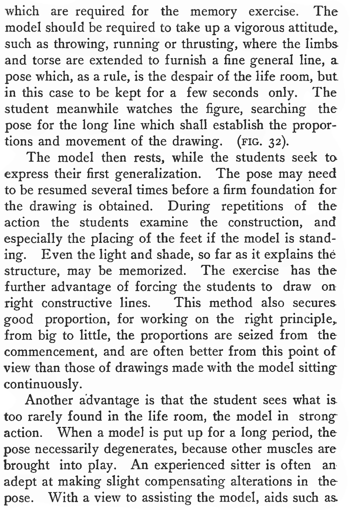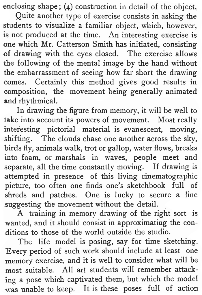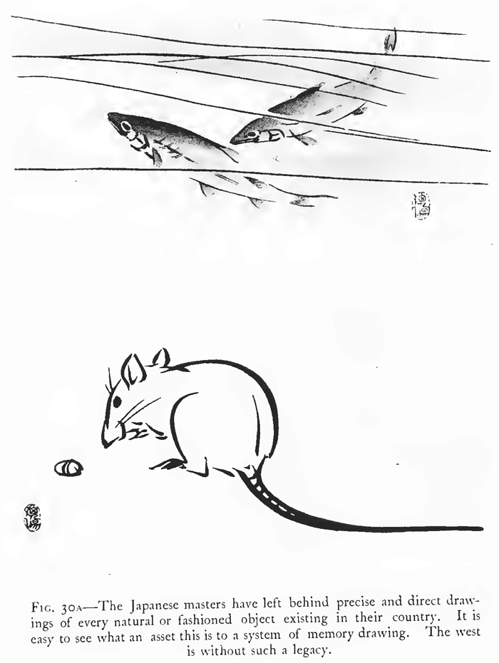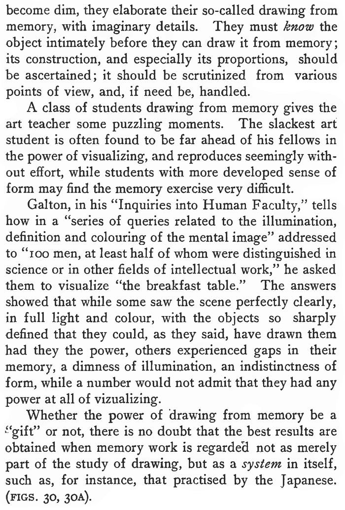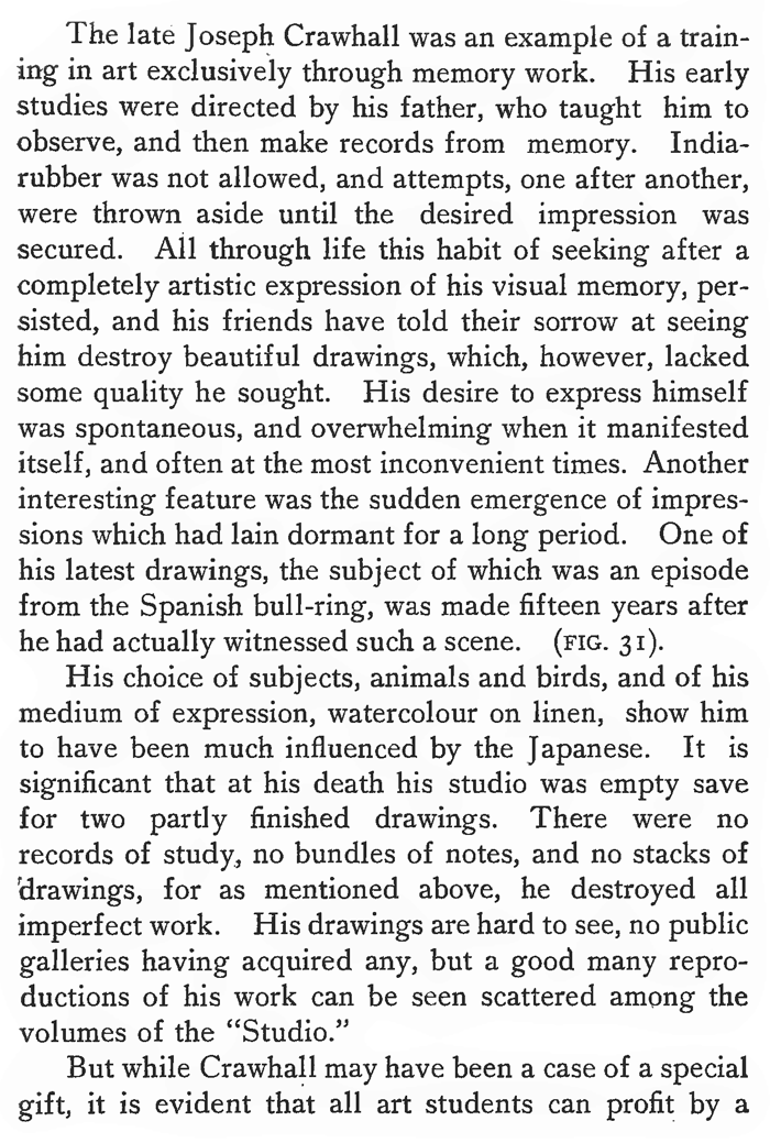 DRAWING FROM MEMORY.Many professional artists from necessity have had to train themselves in drawing from memory long after their student days were over. The translation of the writings of Lecocq de Boisbaudran has had some share in the interest now taken by schools of art in the subject. Lecocq especially emphasized the necessity for the visual retention of a definite form, and drawing being taught in those days from flat copies, he naturally used them, thus obtaining the clear precise statement of fact which he desired. His first exercise was the outline of a nose, and from this his teaching extended over the whole field of representative and imaginative art. Memory drawing as practised at present often takes lines quite other than those of Lecocq, sometimes missing his basis of definite form. Pupils are sometimes shown an object of intricate construction for a few moments, and are then expected to reproduce h from memory. They may have looked at it superficially, but they have not really examined it and made themselves thoroughly acquainted with its proportions and structure. Consequently after their memory vision has become dim, they elaborate their so-called drawing from memory, with imaginary details. They must know the object intimately before they can draw it from memory; its construction, and especially its proportions, should be ascertained; it should be scrutinized from various points of view, and, if need be handled. A class of students drawing from memory gives the art teacher some puzzling moments. The slackest art student is often found to be far ahead of his fellows in the power of visualizing, and reproduces seemingly without effort, while students with more developed sense of form may find the memory exercise very difficult. Galton, in his "Inquiries into Human Faculty," tells how in a "series of queries related to the illumination, definition and colouring of the mental image" addressed to "Ioo men, at least half of whom were distinguished in science or in other fields of intellectual work," he asked them to visualize "the breakfast table." The answers showed that while some saw the scene perfectly clearly, in full light and colour, with the objects so sharply defined that they could, as they said, have drawn them had they the power, others experienced gaps in their memory, a dimness of illumination, an indistinctness of form, while a number would not admit that they had any power at all of vizualizing. Whether the power of drawing from memory be a "gift" or not, there is no doubt that the best results are obtained when memory work is regarded not as merely part of the study of drawing, but as a system in itself, such as, for instance, that practised by the Japanese. (FIGS. 30, 30A). The late Joseph Crawhall was an example of a training in art exclusively through memory work. His early studies were directed by his father, who taught him to observe, and then make records from memory. India-rubber was not allowed, and attempts, one after another, were thrown aside until the desired impression was secured. All through life this habit of seeking after a completely artistic expression of his visual memory, persisted, and his friends have told their sorrow at seeing him destroy beautiful drawings, which, however, lacked some quality he sought. His desire to express himself was spontaneous, and overwhelming when it manifested itself, and often at the most inconvenient times. Another interesting feature was the sudden emergence of impressions which had lain dormant for a long period. One of his latest drawings, the subject of which was an episode from the Spanish bull-ring, was made fifteen years after he had actually witnessed such a scene. (FIG. 31). His choice of subjects, animals and birds, and of his medium of expression, watercolour on linen, show him to have been much influenced by the Japanese. It is significant that at his death his studio was empty save for two partly finished drawings. There were no records of study, no bundles of notes, and no stacks of 'drawings, for as mentioned above, he destroyed all imperfect work. His drawings are hard to see, no public galleries having acquired any, but a good many reproductions of his work can be seen scattered among the volumes of the "Studio." But while Crawhall may have been a case of a special gift, it is evident that all art students can profit by a training in memory, and gain from it certain important benefits. Whistler is an instance of an artist who trained himself to draw from memory, and Menpes' account of the way he studied his nocturnes on the spot with a friend, turned his back on the scene, and described the effect; kept it before his consciousness during the evening, and painted the picture the following morning, makes very interesting reading. We may almost consider him a pupil of Lecocq, some of whose students he knew. Millet is another example of a painter, who lounged about Barbizon, apparently the laziest man there, but all the time absorbing the form and spirit of the peasant life around him. Afterwards in his studies he "squeezed the sponge" and produced those paintings, of which the simplicity of the composition, the largeness of the forms and the unity of the whole, make it certain that they were not produced out of doors under an umbrella, and amid the distractions of details and variety, which invariably occur when one is painting from nature. When one looks at the drawings and paintings of the Chinese and Japanese—all memory work—one is amazed at the intimate character of the expression of form. The familiarity with the structure extends to the minutest detail. Early exercises in memory drawing should take note of this quality and insist on the exercises being of objects with which the students are familiar, or which they can examine closely. The procedure of examination might follow some such steps as these :—(1) general proportions ; (2) type form, as cube or cylinder, on which the object