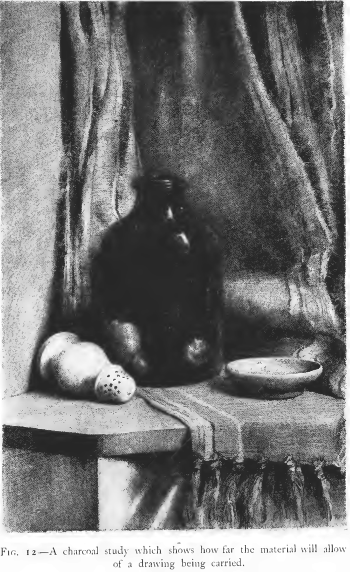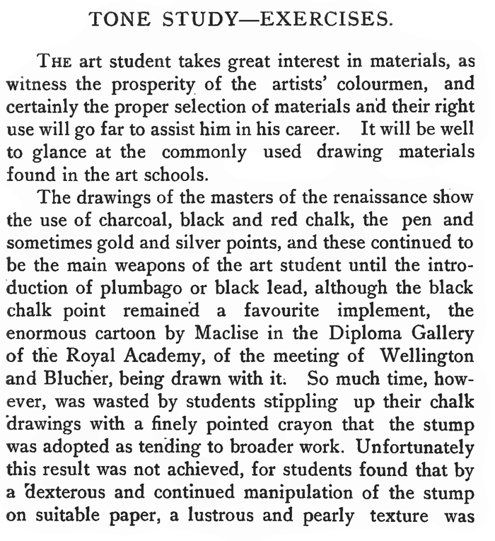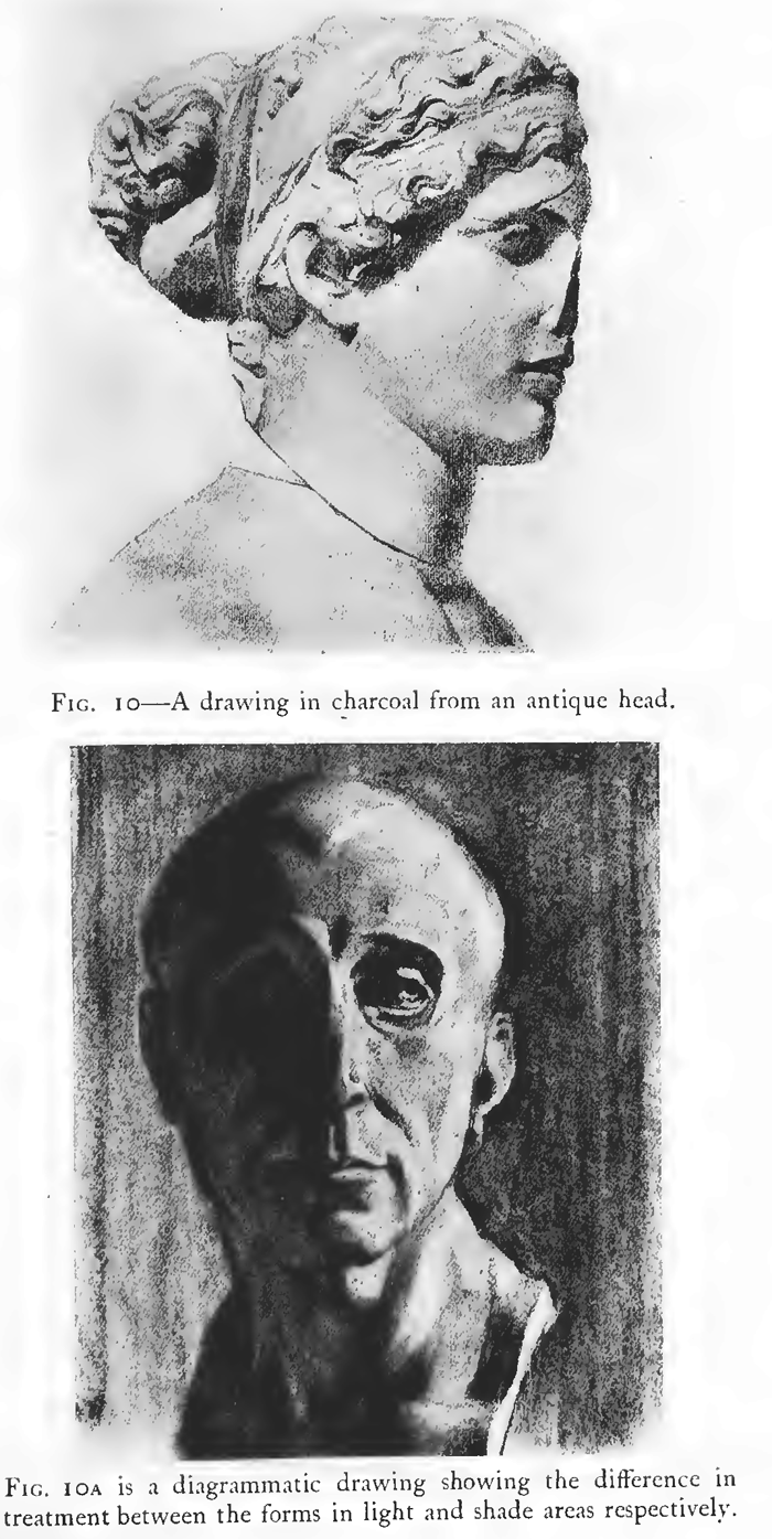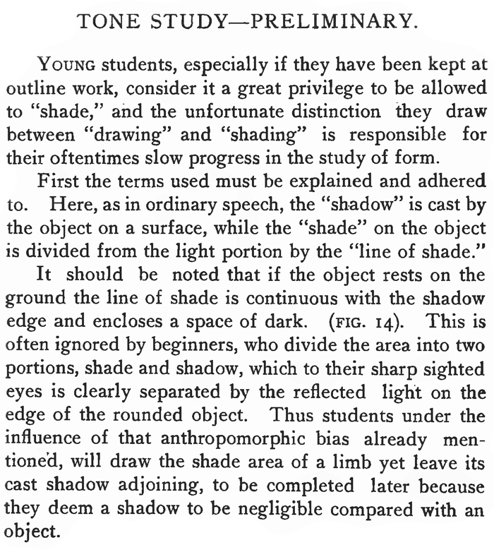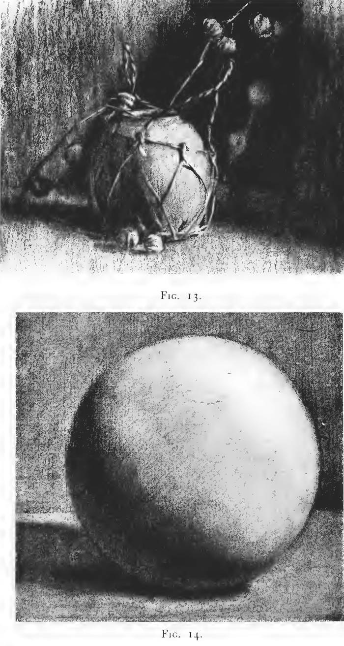 The text above is made up of images, to copy some text, it is below. TONE STUDY—PRELIMINARY.Young students, especially if they have been kept at outline work, consider it a great privilege to be allowed to "shade," and the unfortunate distinction they draw between "drawing" and "shading" is responsible for their oftentimes slow progress in the study of form. First the terms used must be explained and adhered to. Here, as in ordinary speech, the "shadow" is cast by the object on a surface, while the "shade" on the object is divided from the light portion by the "line of shade." It should be noted that if the object rests on the ground the line of shade is continuous with the shadow edge and encloses a space of dark. (FIG. 14). This is often ignored by beginners, who divide the area into two portions, shade and shadow, which to their sharp sighted eyes is clearly separated by the reflected light on the edge of the rounded object. Thus students under the influence of that anthropomorphic bias already mentioned, will draw the shade area of a limb yet leave its cast shadow adjoining, to be completed later because they deem a shadow to be negligible compared with an object. The line of shade is of great importance because it represents a contour seen from the direction of the light.. It may be gray and indefinite when the light-area is extensive, as a large window admitting daylight, or sharp and dark when the luminant is a point of artificial light, but it is always present. Students sometimes shade as if the dark gradually merged into the light. This is a convention which is not supported by observation, and should be discouraged. A certain amount of light is reflected to the object from the floor, walls, etc. This is not traceable on the side towards the light, but may be observed in the shade area, especially a contour in shade. It follows that the shade area appears darkest as it approaches the light area, that is to say near the edge of shade. The rule as stated in art school diction is that "the darkest dark is near the lightest light." This is clearly seen in small isolated darks. The forms within a shade area often present great difficulties to beginners, who see them necessarily by reflected light. They outline these forms with black, or darken unduly the concavities, and are distressed to find that these lines and darks persist in coming forward, and ruin the unity of the shade area. To remedy this they should note an interesting contrast between the conditions of the expression of forms in (I) areas in light and (2) areas in shade. First, the surface forms in the light are expressed by darks, excepting, of course, the high lights. The eyelids are defined by darks below the brows, the nose and lips by darks, and the ear by lines and patches of dark. In the shade areas, however, forms are expressed by reflections or lights. If this region is indicated by a general tone, the forms within need little more attention than the careful working of the reflected lights. Of course, an actual cavity receiving no reflected light, such as the nostril or ear orifice, may have to be darkened, but otherwise the principle holds good. Between the two areas there is another important difference. According to the intensity of light the forms in the light areas are well defined, and show clearly. In the shade area forms are ill-defined, edges are soft, somewhat as we notice shapes in twilight when men look "like trees walking." All painters from Rubens onwards have been well aware of this. Rubens used his impasto for his light areas, but was particularly careful to keep the forms within his darks quiet. Similarly the student when working at the shade area must remember to hold the reflected lights under control. Too often he emphasizes them until they actually look like "lights" blazing out of the darkness, as if the figure were lit from within, or made of glass or china. Or again he strengthens with 'dark the outlines of the forms within the shade area, with the result that they refuse to retire, and obstinately stand forward. There can be no hard lines in the shade, owing to want of illumination. As the luminant is generally from above, the darks in light areas occur below the forms, while the main reflection, coming from below, the reflected light is seen in the upper part of the concavities of the forms, much as the footlights illuminate those parts of the actor's features. Figure. IOA shows the general principle of working both light and dark areas. The drawing was made by artificial light. TONE STUDY—EXERCISES.The art student takes great interest in materials, as witness the prosperity of the artists' colourmen, and certainly the proper selection of materials and their right use will go far to assist him in his career. It will be well to glance at the commonly used drawing materials found in the art schools. The drawings of the masters of the renaissance show the use of charcoal, black and red chalk, the pen and sometimes gold and silver points, and these continued to be the main weapons of the art student until the introduction of plumbago or black lead, although the black chalk point remained a favorite implement, the enormous cartoon by Maclise in the Diploma Gallery of the Royal Academy, of the meeting of Wellington and Blucher, being drawn with it. So much time, however, was wasted by students stippling up their chalk drawings with a finely pointed crayon that the stump was adopted as tending to broader work. Unfortunately this result was not achieved, for students found that by a 'dexterous and continued manipulation of the stump on suitable paper, a lustrous and pearly texture was obtained. This could be again refined upon, by touching with a finely pointed chalk, and by "breading out" black spots, prodigies of industry being performed on such drawings. Thus did the misapplied industry of students defeat the efforts of teachers. The stump has also other disadvantages besides this great 