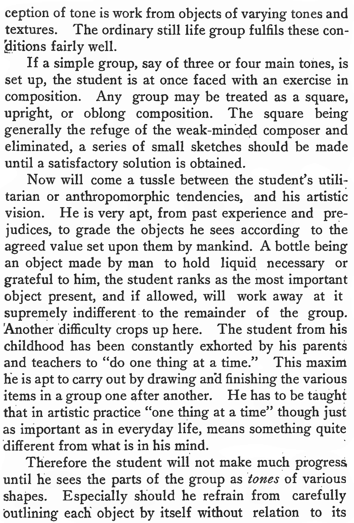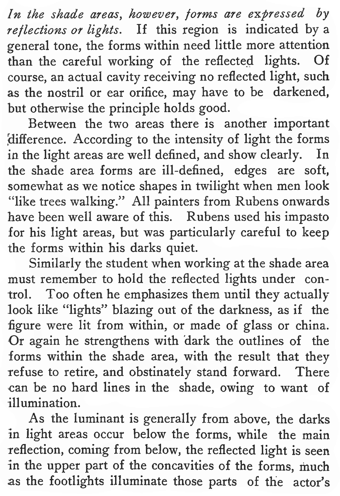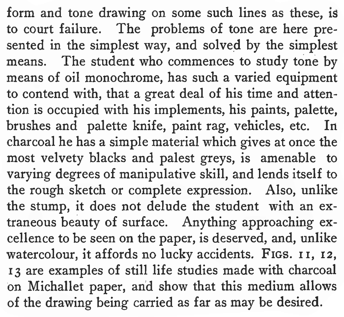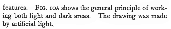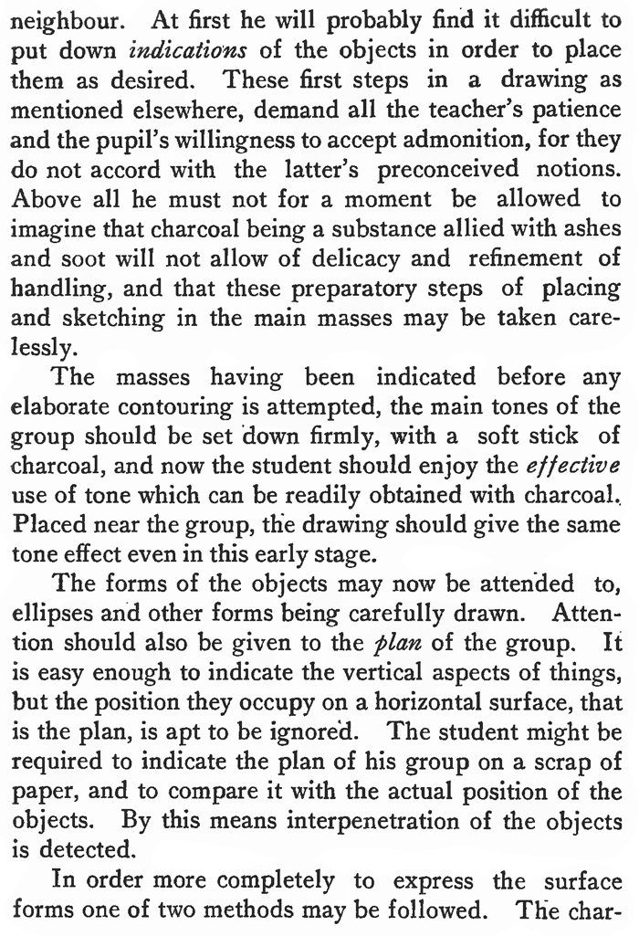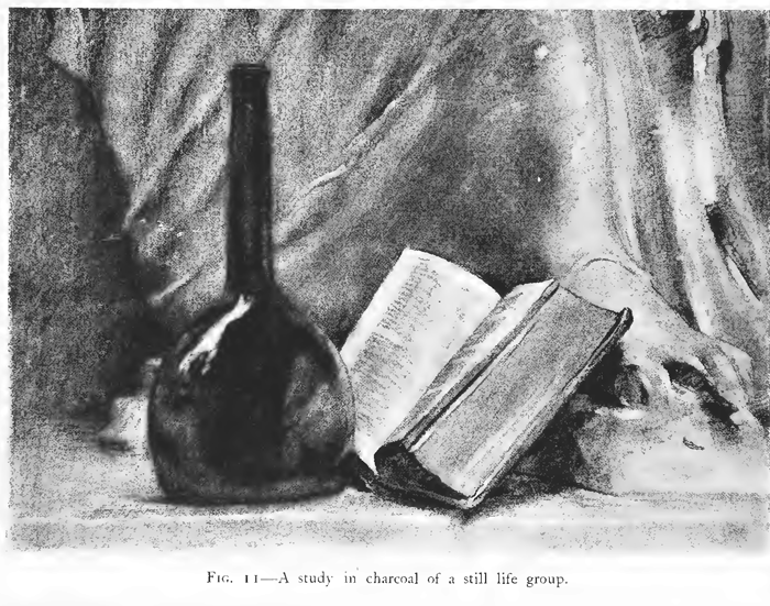 The text above is made up of images, to copy some text, it is below. TONE STUDY—PRELIMINARY.Young students, especially if they have been kept at outline work, consider it a great privilege to be allowed to "shade," and the unfortunate distinction they draw between "drawing" and "shading" is responsible for their oftentimes slow progress in the study of form. First the terms used must be explained and adhered to. Here, as in ordinary speech, the "shadow" is cast by the object on a surface, while the "shade" on the object is divided from the light portion by the "line of shade." It should be noted that if the object rests on the ground the line of shade is continuous with the shadow edge and encloses a space of dark. (FIG. 14). This is often ignored by beginners, who divide the area into two portions, shade and shadow, which to their sharp sighted eyes is clearly separated by the reflected light on the edge of the rounded object. Thus students under the influence of that anthropomorphic bias already mentioned, will draw the shade area of a limb yet leave its cast shadow adjoining, to be completed later because they deem a shadow to be negligible compared with an object. The line of shade is of great importance because it represents a contour seen from the direction of the light.. It may be gray and indefinite when the light-area is extensive, as a large window admitting daylight, or sharp and dark when the luminant is a point of artificial light, but it is always present. Students sometimes shade as if the dark gradually merged into the light. This is a convention which is not supported by observation, and should be discouraged. A certain amount of light is reflected to the object from the floor, walls, etc. This is not traceable on the side towards the light, but may be observed in the shade area, especially a contour in shade. It follows that the shade area appears darkest as it approaches the light area, that is to say near the edge of shade. The rule as stated in art school diction is that "the darkest dark is near the lightest light." This is clearly seen in small isolated darks. The forms within a shade area often present great difficulties to beginners, who see them necessarily by reflected light. They outline these forms with black, or darken unduly the concavities, and are distressed to find that these lines and darks persist in coming forward, and ruin the unity of the shade area. To remedy this they should note an interesting contrast between the conditions of the expression of forms in (I) areas in light and (2) areas in shade. First, the surface forms in the light are expressed by darks, excepting, of course, the high lights. The eyelids are defined by darks below the brows, the nose and lips by darks, and the ear by lines and patches of dark. In the shade areas, however, forms are expressed by reflections or lights. If this region is indicated by a general tone, the forms within need little more attention than the careful working of the reflected lights. Of course, an actual cavity receiving no reflected light, such as the nostril or ear orifice, may have to be darkened, but otherwise the principle holds good. Between the two areas there is another important difference. According to the intensity of light the forms in the light areas are well defined, and show clearly. In the shade area forms are ill-defined, edges are soft, somewhat as we notice shapes in twilight when men look "like trees walking." All painters from Rubens onwards have been well aware of this. Rubens used his impasto for his light areas, but was particularly careful to keep the forms within his darks quiet. Similarly the student when working at the shade area must remember to hold the reflected lights under control. Too often he emphasizes them until they actually look like "lights" blazing out of the darkness, as if the figure were lit from within, or made of glass or china. Or again he strengthens with 'dark the outlines of the forms within the shade area, with the result that they refuse to retire, and obstinately stand forward. There can be no hard lines in the shade, owing to want of illumination. As the luminant is generally from above, the darks in light areas occur below the forms, while the main reflection, coming from below, the reflected light is seen in the upper part of the concavities of the forms, much as the footlights illuminate those parts of the actor's features. Figure. IOA shows the general principle of working both light and dark areas. The drawing was made by artificial light. TONE STUDY—EXERCISES.The art student takes great interest in materials, as witness the prosperity of the artists' colourmen, and certainly the proper selection of materials and their right use will go far to assist him in his career. It will be well to glance at the commonly used drawing materials found in the art schools. The drawings of the masters of the renaissance show the use of charcoal, black and red chalk, the pen and sometimes gold and silver points, and these continued to be the main weapons of the art student until the introduction of plumbago or black lead, although the black chalk point remained a favorite implement, the enormous cartoon by Maclise in the Diploma Gallery of the Royal Academy, of the meeting of Wellington and Blucher, being drawn with it. So much time, however, was wasted by students stippling up their chalk drawings with a finely pointed crayon that the stump was adopted as tending to broader work. Unfortunately this result was not achieved, for students found that by a 'dexterous and continued manipulation of the stump on suitable paper, a lustrous and pearly texture was obtained. This could be again refined upon, by touching with a finely pointed chalk, and by "breading out" black spots, prodigies of industry being performed on such drawings. Thus did the misapplied industry of students defeat the efforts of teachers. The stump has also other disadvantages besides this great 
