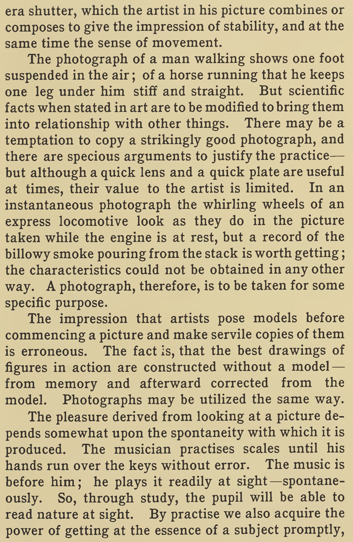DRAWING LESSONS IN EASY SKETCHINGDrawing from nature compels the student to observe, to appreciate what he sees, and the act of drawing fixes the image clearly and permanently in his memory. As the eye becomes trained it picks out more and more unerringly the beautiful, but at first all things ought to have an interest. The student should proceed on the plan that he finds himself in a strange world where everything has the charm of novelty, and that sketches are to be considered artistic capital for future needs. Then even the ordinary utensils of daily use will have a new meaning to him. A wheelbarrow, for example, is a familiar object, but make a drawing of one from memory and compare it with an actual wheelbarrow. No further proof will be necessary to convince one that there is much to be learned even from the commonplace. The artist looks for " picture quality " in the things about him. The grandeur of a mountain he may ignore for a bit of barnyard, or the glorious sunset for the fire in a village smithy, because he has learned to discriminate between the things that are within the range of painting and those that are not. No matter how interesting or magnificent a view may be it does not necessarily follow that it is suitable to graphic art or can be produced with the means at our disposal. This fact is not generally appreciated. Graphic art deals with appearances, not with material truths. We know the kettle is made of copper, but to the painter a glint of light transforms it into burnished gold. The beginner who is too conscious of local color is likely to fall into error and paint what he thinks, not what he sees. Although blades of grass are green, a field of grass may appear yellow, violet, gray or some other color. The student should promptly learn to seek for character in the objects he undertakes to sketch. The new timbers under a wharf are probably stronger and better suited to support weight than those which they replaced, but the old ones were covered with moss and had " character " ; they were picturesque and artistically superior to the new ones. In sketching, first consider general appearances. Partially close the eyes, or squint, in order to see the masses without detail, and note the values. If this is all that you have time or opportunity to secure the sketch is worth preserving, for it will always serve as a reminder to the mental vision of something the eye has seen. The slightest memorandum may contain the happiest suggestion, and even written notes will recall to memory effects which otherwise might be forgotten. A helpful and permissible way of getting proportions is to hold the pencil at arm's length, in line with the subject to be sketched, and run the thumb up and down on it until the distance between the end of the pencil and the thumb coincides with the space seen between two points in the model, as, for instance, the height of a door. Still keeping the arm at full length, turn the pencil around and find another measurement to equal the first, say from the edge of the door to the window. Half the height of the window is equal to the width of the door, and so on. As there are skeletons in live creatures, so in an artistic sense there are skeletons to inanimate things. A landscape has its skeleton —a tree or a building. And while correctness of drawing is to be the artist's ultimate object, the surest way to secure it is by knowing the underlying principles of construction. Facility in sketching cannot be gained by imitating another's work. If it were possible to acquire the impulse, knowledge and certainty of the master hand by copying, teaching art would be a very simple matter, but the power by which good works are produced must be sought for in adequate experience and consequent skill acquired. Do not make your problems difficult ; the complex are not the most interesting —often the reverse. A gate post may have in it sufficient variety of light and shade to claim your best attention. On the weather-beaten surface of a barn door nature may produce a symphony in color. It is for you to discover her charms and interpret them for the benefit of others. That is the mission of the artist. When we remember that nothing we do can be undone or effaced, it behooves the student to be deliberate, careful and serious in his work. Purposeless daubing with a brush or scratching with a pen is a step backward. Wasted time cannot be recovered, and the dissipation of energy is debasing and enervating to the faculties. Self-discipline is the hardest and at the same time the most important task that the student faces. Sketching in water colors is not advised for the beginner, for the reason that the attention is diverted by the uncertain nature of the medium. It is usually the accidental blending of washes which makes a water color drawing interesting, but for serious study the pupil should not resort to it, at least until he knows how to paint and draw with exactness. A careful pen or pencil sketch with written descriptions of the color effects, which afterward may be translated with the oil colors or chalks, will answer every purpose. Pastels or colored chalks are admirably suited for sketching. Rough paper is used and the colors are gently blended, or " rubbed in " with the fingers. Great care must be exercised, so that the color does not brush off, however, as there is no way of " fixing " pastels. These chalks come in every tint and shade and any one can use them without special instruction. It is with some reluctance that instantaneous photographs are admitted to be of help to the artist, because the student is prone to place too much reliance upon them, and to forget that sure knowledge only comes in the actual drawing from nature. In the hands of one who has already learned to draw, to paint, to select, they may be resorted to as an expedient to obtain realism in figures with action, but it should be remembered that the instantaneous photograph does not satisfy 