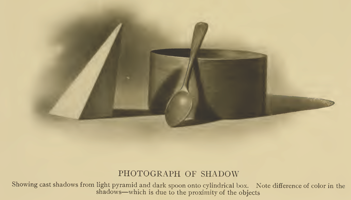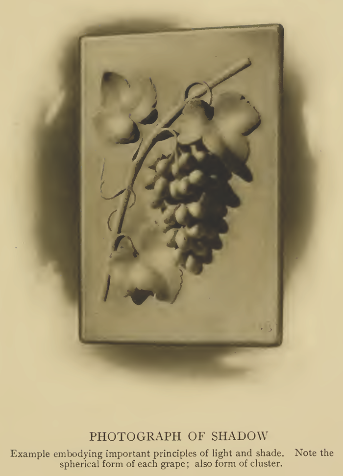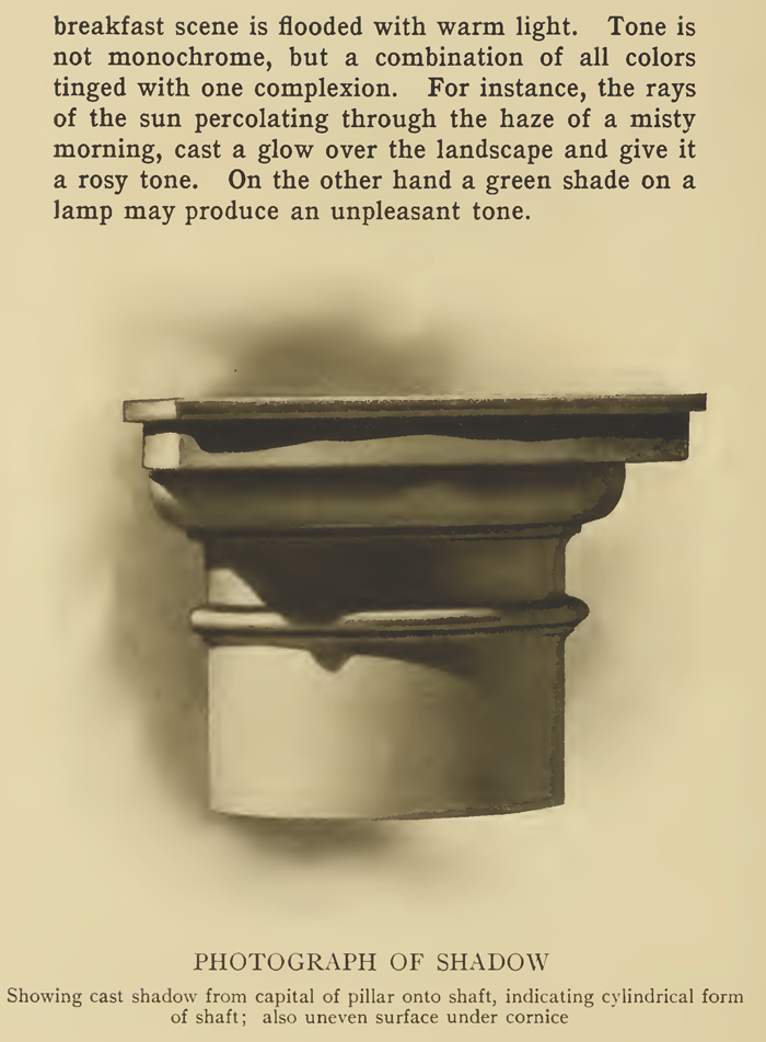 The text above is made up of images, to copy some text, it is below. LIGHTS AND SHADOWSThe characteristic feature of graphic art is the representation of form and space upon a flat surface by means of light and shadow, rendered either in black and white or in color. The use of light and shade in painting dates from about the Thirteenth century, but the artists of that period rarely attempted more than the delineation of selected near-by objects. Rembrandt, the acknowledged master of light and shade, by the disposal of graduated tones, was the first to succeed in expressing distance as well as solid form. The beginner finds light and shade so closely associated with color that it is difficult to accurately judge one irrespective of the other without some knowledge of the principles which govern their relationship. The intensity of color depends upon light or the amount of illumination under which it is seen. Where the sunlight touches a red cloth the color is brilliant ; in the shadow it appears dull, yet we know the cloth to be the same red all over. It is the difference in the intensity of the red rays which causes the color to vary in appearance. These degrees of intensity are called the " tones " of red, of blue, of yellow or whatever color is meant, just as C natural is a tone in music. It may be in the higher octaves or in the lower, but always the note is C natural. We speak of a piece of music as pitched in a high key when it is arranged for high notes, or in a low key when arranged for the low notes. A picture painted in a high key is one where light tones prevail, and in a low key where dark tones prevail. A night scene would be in a low key ; a landscape in sunlight high in key. In a Claude Lorrain glass one sees how nature is lowered to a pitch within the possibilities of painting. If we paint a picture altogether in light tints or altogether in dark shades we do not utilize the entire scale of tones at our disposal, or if we do not take pure white paint for our highest light, and if our lowest color note is not absolute black, the full limit of the palette has not been reached. The key in which a picture is painted is not important, provided the proportion and relation of the lights and darks are right. While there are no rules that govern the exact amounts of light, middle tint and deep shadow which shall be used to make a picture agreeable, the artist must arrange and distribute them so as to secure a proper balance. Obscurity and heaviness are to be avoided in low-toned pictures, and to give variety to those painted in a high key restful shadows must be introduced. Indoor effects are softer than outdoor effects because the tones melt into one another without harsh contrast. " As smoke loses itself in the air, so are the lights and shadows to pass from one to the other without any apparent separation," is a maxim attributed to Leonardo da Vinci, and it is a valuable suggestion to the pupil. Nature is not violent in her effects except on rare occasions, and when high lights are brought into contact with strong darks in a picture the contrast should be made with care and deliberate intention. Everything, from the mountain range to the finest grain of sand, has form, revealed to the eye by light and shadow, regardless of its color. Light and shade make a grape round, and they also give form to the cluster as a whole. Light and shade make some parts of an object appear to come forward and other parts to recede. On the sphere, the cylinder, the human figure, or upon any curved surface, shadow separates from light gradually, but on angular surfaces light and shade separate abruptly. In considering light and shade, distinction should be made between natural shade and accidental shadow. Natural shade is the shade which is inseparably connected with every object reflecting light. Accidental shadow is the shadow which one object casts upon another object by the former being interposed between the latter and the light. An accidental shadow may be lighter or it may be darker than the object casting the shadow. If the object casting the shadow be of the same color as the object upon which the shadow falls, then the shadow itself is darker than the shaded side of the object casting it, and it is still darker if it falls on an object darker than itself. When an object casts its shadow on another object of lighter color then the shadow is lighter than the shaded side of the object casting the shadow. However, this is not an invariable rule, as shadow is also affected by reflected light. Cast shadows do not indicate the forms of the objects casting them, but conform to the surface of the one that receives them. Without the aid of the cast shadow it is often difficult to explain or comprehend a surface. Cast shadows have well-defined edges, no matter whether the objects casting them are curved or angular. All cast shadows are darkest when closest to the object casting them, and they are lightest when most distant from that object. The lights on objects receiving cast shadows appear brightest where they are in immediate contact with the darkest of these shadows. The color of an object is also influenced by the color reflected upon it from some other object. An object in direct sunlight appears lighter in color than it does indoors, and the real color of an object is more easily determined in diffused light than when illuminated by direct rays. Cast shadows out of doors are really lighter than cast shadows indoors, although they may not appear so. It is contrast which gives the brilliancy of effect. Claude Monet, the great " luminarist," who painted " trees that sway in the breeze, clouds that scud across the sky and water that ripples over the stones," invariably refused to teach. " Go to nature ; paint what you see," said he to those who wanted to learn his method. " There is no trick, but I tell you paint that tower forty times, as I have done, to learn the effects of light. They are changi