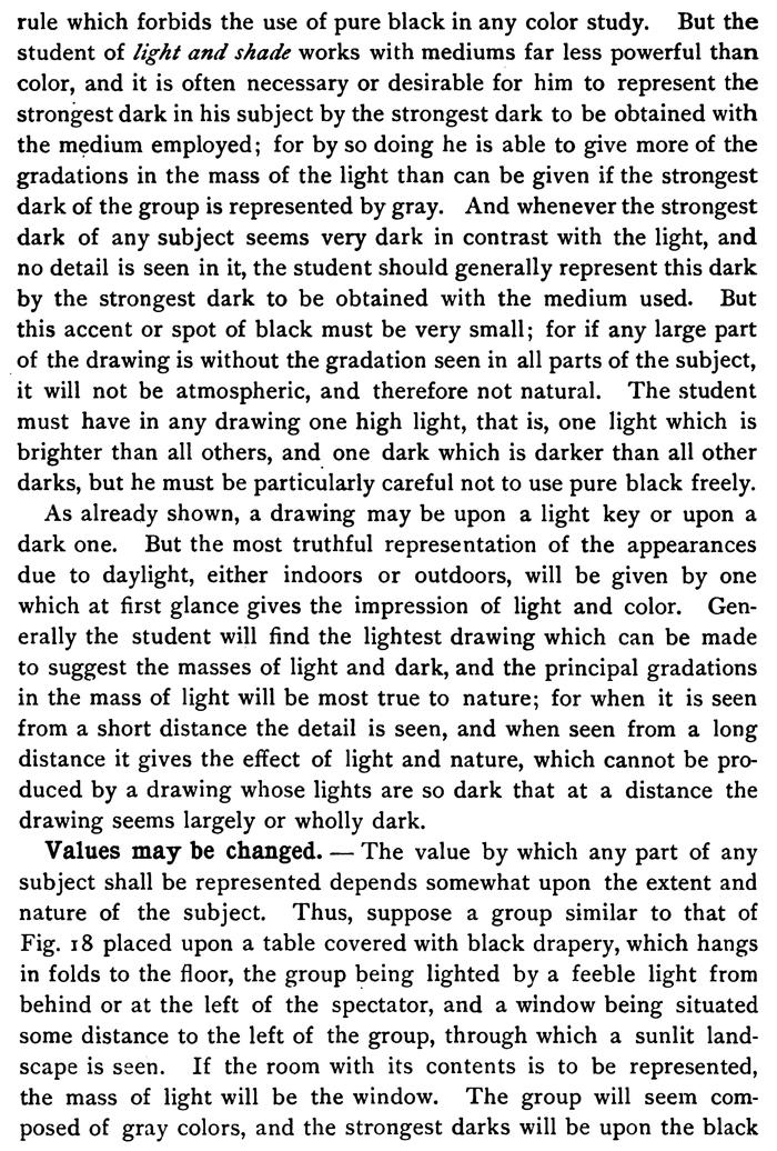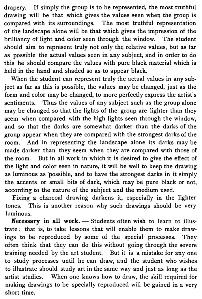 DRAWING VALUES.Definition.Value means the relations of tones to each other, and concerns the quantity of light or dark they reflect without regard to color, so there may be many different colors of the same value. With different colors there is usually a difference in value, so that a light and shade drawing may generally be true to nature in values and yet suggest the different colors throughout the subject. Value has to take into account not only different colors but different tones of the same color, and also variations in the effect of one tone or color which are produced by distance or by light and shade, and value is generally understood by artists to mean variations of light and dark produced by any cause whatever. All the variations of effect explained in Chap. I are differences in value, and the student will at once see that upon the values depends most of the merit of any black and white study. Unit of value.In a light and shade drawing black is usually taken as the unit for comparison, the strongest values being those which are nearest black, the lowest (lightest) values those which are farthest from black. In color work the unit for comparison is white, the strongest values are those which reflect the most light to the eye, and the lowest (darkest) values those which send the least light to the eye. Truth of value.The art student should be continually asking himself if his drawing is like nature, and his first problems should deal principally with comparisons of his work with nature, which he will generally be able to make, so as to discover any important differences. Here the question arises, " How far is it possible to imitate nature ? " The strongest light of the artist is given by white paint ; even the effect of sunlight upon pure white must be represented by means of white paint. Hence the bright lights of nature are often much brighter than those of a painting seen in the light of any common gallery or room. It is natural, then, to ask if it is possible in every case to produce a picture which is like nature. It is well to consider this point, although this question is more important to the artist than to the elementary student who works in a studio and does not have sunlight effects to represent. The strongest lights of a landscape, whether in sunlight or in moonlight, are represented by the same white paint, with perhaps faint tints of warm and cool colors respectively added. Sunlight is many times brighter than moonlight ; and yet one picture suggests sunlight satisfactorily, and the other, moonlight. Neither picture represents nature, but simply suggests one of her effects. In each picture the artist's problem is very different from that of the student, who works indoors and can place his drawing beside the subject and study both at an equal distance and in the same light. In such a case, though the glitter lights of the subject may be lighter than those of the drawing, there is not the great difference that exists between the high lights out of doors and the effect of white paint in a studio ; hence the art student is often able to make a drawing whose contrasts are as great as those of the subject in a studio. With color he can do this more frequently than with black and white. But when he attempts sunlight effects, it is impossible to obtain in any drawing lights equal in intensity to those of nature, With the same contrasts of black and white and color he is obliged to give the effect of moonlight and of light many times stronger. Not reproduced, but suggested.The artist is able to represent with the same pigments such very different effects, because he is not obliged to reproduce the actual colors or contrasts, but simply to suggest them. As shown in Chap. I, nature's effects are due to contrasts of masses of light and dark and color, and whenever these contrasts are suggested, the effect of the subject will be created. The masses are much more simple by moonlight than by sunlight, but either effect will be expressed by representing correctly the relations of the various masses of light and dark ; in other words, the problem is simply that of values. If the relation of any light or dark to every other in the moonlight subject is correctly given, the picture will create a satisfactory impression of moonlight, and in the same way the effect of sunlight will be given by a picture which gives the relations between the different masses of the sunlit landscape. High or low.In the case of moonlight or that of sunlight, the picture may be in a high key or in a low key and still produce a satisfactory impression of the subject. Thus the same sunlight effect may be represented by two pictures, one very much darker throughout than the other ; or the same moonlight effect, by two pictures of which one throughout is very much lighter than the other. The relations of light to dark in each pair are, however, the same, and so they give the effect of sunlight or of moonlight, while their general effect is very different. It is in fact possible for a satisfactory impression of moonlight upon any subject to be given by a picture whose general effect is little, if any, darker than that of another canvas which gives a satisfactory impression of sunlight upon the same subject. Whether the light upon any subject be strong or weak, it will produce masses of light and dark and gradations of tone ; and if the relations of these masses and tones are correctly represented, the effect of the subject will be expressed, whether the contrast between the different values is very strong or not. There are no more lights or no more shadows with a strong light than with a weak one, and there are as many gradations of light and shade with the former as with the latter; in fact, there is often less gradation with the strong light than with the weak. So it is simply a question of values, and the weakness of pigments in contrast with nature is a difficulty which has been greatly magnified. To produce