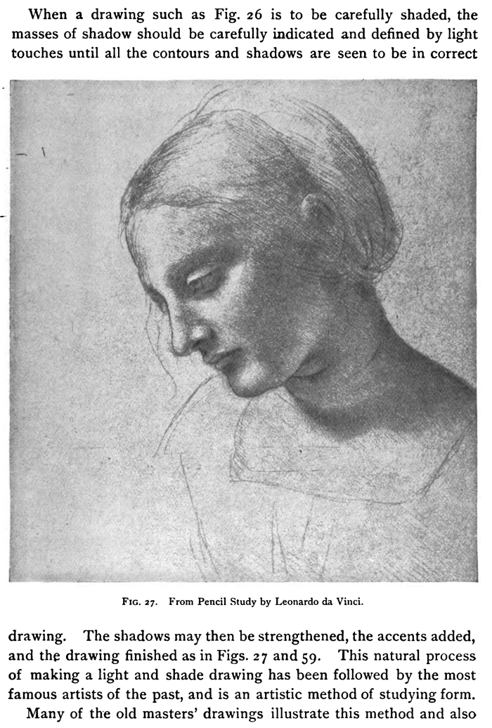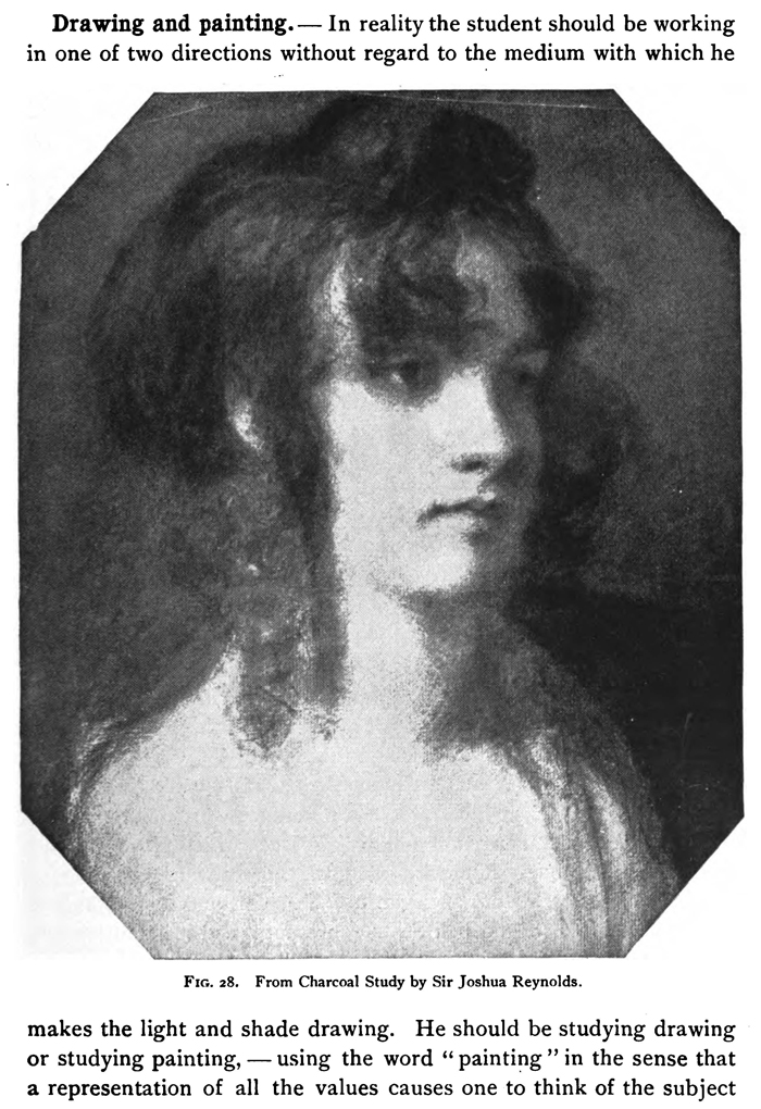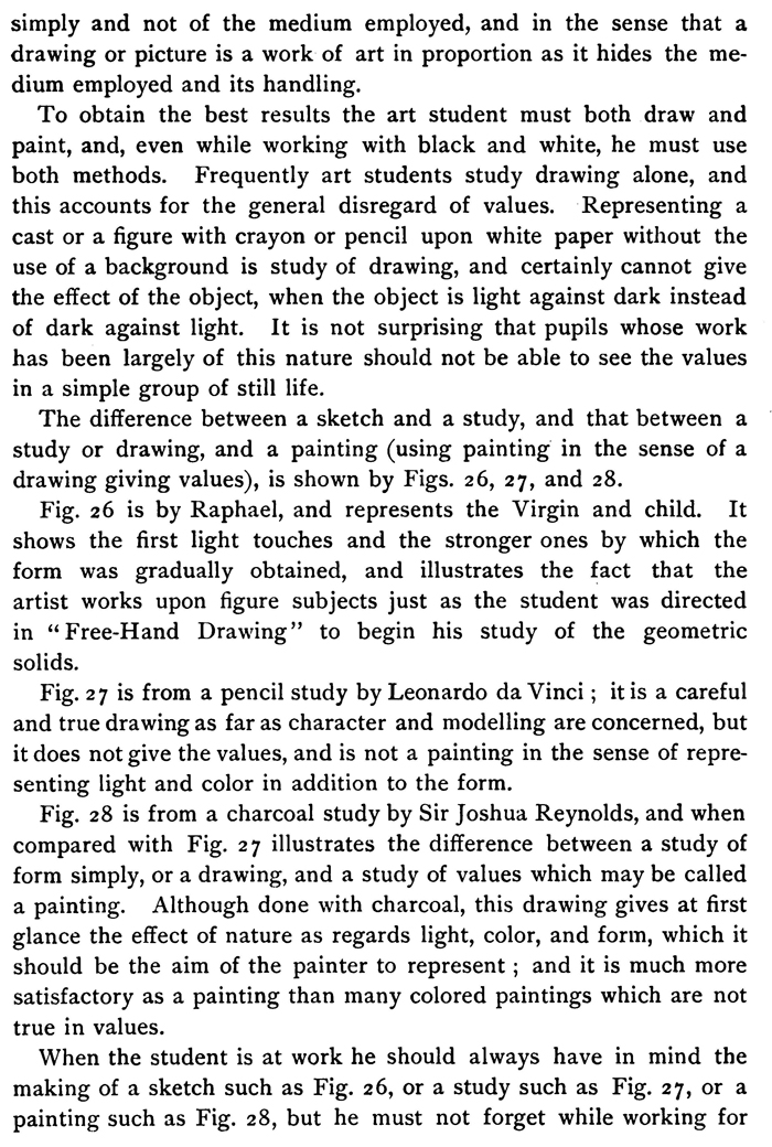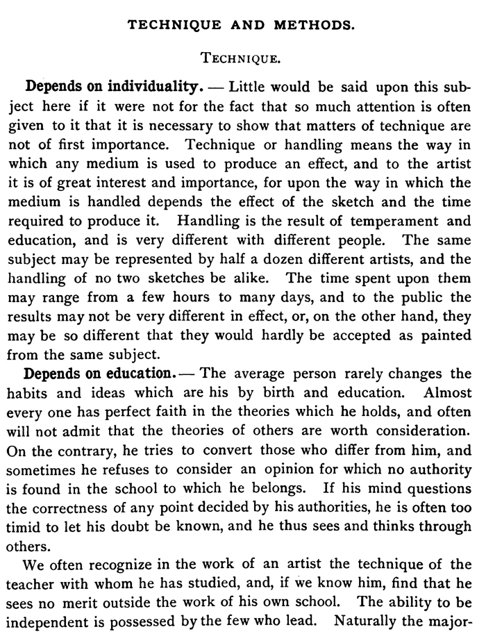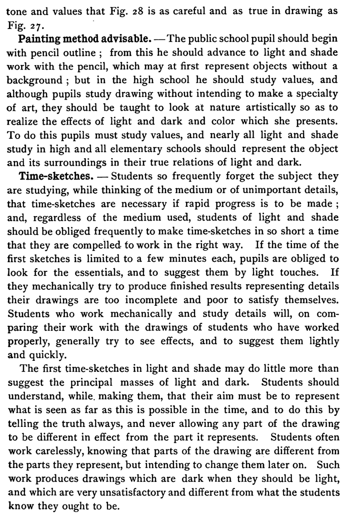 TECHNIQUE AND METHODS.Depends on individuality.Little would be said upon this subject here if it were not for the fact that so much attention is often given to it that it is necessary to show that matters of technique are not of first importance. Technique or handling means the way in which any medium is used to produce an effect, and to the artist it is of great interest and importance, for upon the way in which the medium is handled depends the effect of the sketch and the time required to produce it. Handling is the result of temperament and education, and is very different with different people. The same subject may be represented by half a dozen different artists, and the handling of no two sketches be alike. The time spent upon them may range from a few hours to many days, and to the public the results may not be very different in effect, or, on the other hand, they may be so different that they would hardly be accepted as painted from the same subject. Depends on education.The average person rarely changes the habits and ideas which are his by birth and education. Almost every one has perfect faith in the theories which he holds, and often will not admit that the theories of others are worth consideration. On the contrary, he tries to convert those who differ from him, and sometimes he refuses to consider an opinion for which no authority is found in the school to which he belongs. If his mind questions the correctness of any point decided by his authorities, he is often too timid to let his doubt be known, and he thus sees and thinks through others. We often recognize in the work of an artist the technique of the teacher with whom he has studied, and, if we know him, find that he sees no merit outside the work of his own school. The ability to be independent is possessed by the few who lead. Naturally the major ity seek some one to follow, or, rather, follow instinctively the leaders with whose temperaments they are in harmony. In art this causes the different schools, and gives rise to the conflicting ideas concerning art education. Art judged by unimportant details.The public generally is pleased by detail, the more detail the better, and it compares all work with that of a Meissonier or with a photograph. Some who have studied have passed beyond the stage of search for detail, but even to many of them art often consists principally of the technique of the picture, which is good if similar to that of the artists whose work they have chosen as ideals. Art instruction influenced by fads.The instruction in schools, both elementary and advanced, is too largely influenced by the latest technical fad, which is the technique of those who influence art matters at any particular time. So method supersedes method — there is no accepted standard, and art instruction often deals with matters relating to a medium and its handling, while the foundation of drawing and values receives far too little attention. This is especially true of the work in the public schools, where it has often been necessary to have instruction in drawing given by teachers who have had little opportunity to study drawing. Consequently students have sometimes been told that all methods except one are out of date and harmful, and that drawings made in other ways are bad. For instance, it has been claimed that a charcoal or other light and shade drawing must be made wholly with the point of the charcoal or other pencil and consist of separate lines, and that a drawing in which the lines are at all blended to form a tint is not good. The results of such teaching are generally most mechanical drawings, although they are often better than some of the copies provided to show public school pupils how to make light and shade drawings. Less important than truth.Technique bears the same relation to drawing that style does to the study of the elements of language. Therefore the teacher of elementary work should not allow his pupils to consider technique at all. The pupil should think simply of the truth of the drawing, and the teacher of the way in which the pupil may obtain the truth most quickly and easily. The teacher should remember that every medium may be used in many different ways, and should not restrict individuality of expression that produces true drawings. The aim of a drawing is to create an impression of nature, and any drawing must be bad which, instead of doing this, causes one to think at once of paper and crayon or whatever other medium may be used, or of the way in which it is used. This is a good test for poor technique. With any medium certain facts are self-evident, as, for instance, that the surface of the paper must not be destroyed by erasing ; but such essential points will be discovered by any one who studies, and what is meant is that the spirit of the drawing should always be thought of first, and that difficult methods should not be studied because they are interesting to some noted person. Concerns the advanced student.The art student must be interested in technique, for it involves the mechanical points which he must master thoroughly before he can express himself freely; but questions of technique concern principally advanced students. The elementary student should be taught that the medium must not force itself or its handling upon the eye ; that there must be in any drawing a harmony of treatment throughout its parts ; that it will not do to finish one part perfectly and smoothly and have parts equally important imperfectly and roughly finished. The ability and training of the student, and his aim in studying, must decide whether any medium or particular way of using it should be chosen ; but the elementary teacher must consider simply how he can most quickly train his pupils to see and draw correctly, and he will discard any method which makes the pupil think of the point and the kind of line he is drawing instead of the form or value that should be represented. Many ways of using every med