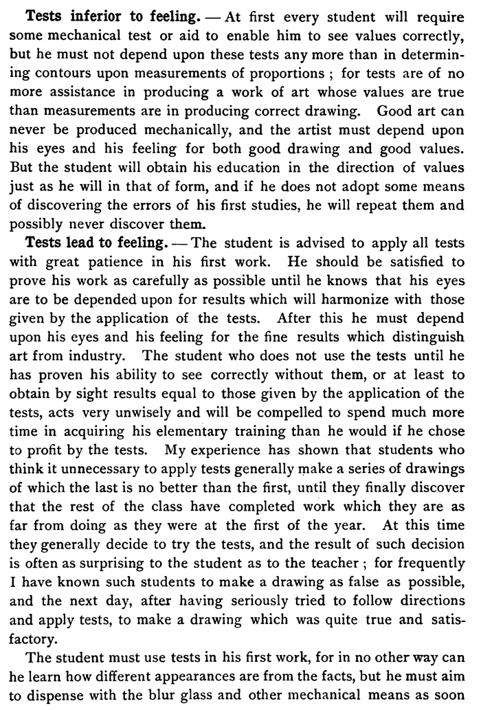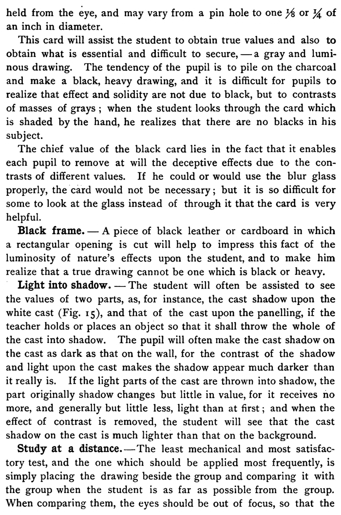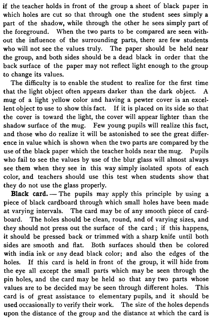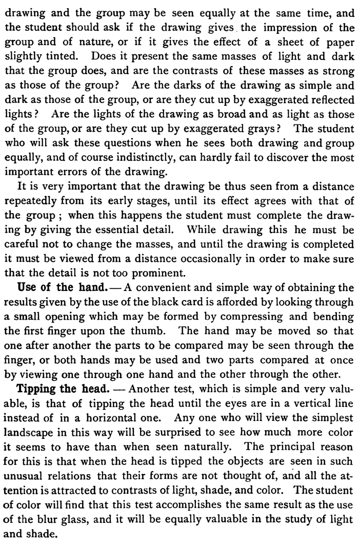 TESTS FOR VALUES.Perfect sight not common.The first and most difficult problem for the art student is to learn to see, for only a few ever learn to see perfectly; and those not giving the matter special attention seldom see the actual appearance of either form, light and shade or color. To realize perfectly what the eye pictures for the mind to read concerning simply the apparent forms of objects requires many years of serious study, and is so difficult that even after this study the artist of reputation is very apt to be deceived and draw what is very different from the image of the eye. In " Free-Hand Drawing" it was shown that a course in free-hand perspective assists the student to avoid faulty representations of the geometric forms, which are most likely to deceive even the practiced eye of the artist. Any student who draws the geometric forms, and tests them as explained in "Free-Hand Drawing," will soon realize that it is difficult to see correctly; for he finds what he thinks he sees to be very different from what the tests prove that he does see, and it is easy for him to convince himself that he cannot see correctly. Values more difficult than drawing.To convince an art student that he cannot see light and shade or color correctly is far more difficult than to prove that he cannot see form correctly. To draw correctly requires, first, an eye naturally true, and, second, a serious and extended course of study; but almost every serious student can in time teach himself to represent form correctly. The same student may work many months, even with the assistance of a teacher, and fail to see values or color correctly. To give the actual facts pictured in the eye concerning light, dark, and color is so difficult that few succeed; and even after years of study many see in nature only the actual facts known, or what they have become accustomed to think they see concerning the local colors of objects. Values not taught.If artists and teachers generally made the study of values as important as that of form, doubtless many students who do not understand what value means would become able to see values correctly; but the number would be small compared with that of those who are able to draw correctly, for serious students of the best teachers often work for many months before they realize how incorrectly they see values. The teacher who insists upon correct values requires much patience and ingenuity, for his pupils cannot readily help- themselves, nor can they believe the teacher who tells them, for instance, that they ought to see, in some special group, dark blue lighter than yellow, when they know that they see it as they think it ought to appear, — darker than the yellow. In such cases the teacher must either be content to say : "If you cannot see it, you must draw it as I say, and in time you will see it as I do," or he must prove to them that at first their eyes tell them nothing but the most glaring falsehoods about all that they see. When pupils realize this fact, and have once received a genuine sight impression concerning values, they will ever afterward see things in a new way, and their improvement will be rapid. Eye sees details instead of values.To see values and realize the effect of the masses, the eye must be used for this purpose only. This is a difficult problem for the student, for naturally the eye is focused upon a single detail, which is clearly seen. The vision passes rapidly over the whole of the group, taking in all its details by means of this careful study, which is of just the same nature as that which the scientist bestows through his microscope upon the specimens he studies. The only difference in their methods is that the motion of the eye of the art student is very rapid, and that the lens of the eye takes the place of the microscope. The scientist sees details, and very properly, since these are what he is to describe. The art student also sees details, and too often his work indicates that he must have examined each little bit as if through a microscope. In his first drawings he usually so magnifies the importance of every detail that his drawing is unintelligible, and gives not the faintest suggestion of the impression produced upon the eye which sees the effects of light, dark, and color in their true relations. The art student must learn that the artist and scientist work for entirely different ends, — that the aim of the artist is not detail, but the spirit and character of the whole, and that this cannot be obtained without making it of first importance and thinking first of the long lines, the large masses, and the effect of the whole subject. Blurred vision necessary.The effect of any subject is never realized when the student looks at any one part ; he must look at the group all at once. The whole of any subject can be seen at once only by seeing all its parts equally and thus indistinctly. That is, the eye must focus on no one part, but be in focus for an object in front of or behind the group ; then all its parts may be seen indistinctly at one time. The student will realize what is meant by blurred vision by closing the eyes gradually until the group can barely be seen between the lids and the lashes ; this cuts off most of the light and obstructs the sight so that the objects are blurred. Blurred vision may also be obtained by holding a pencil in the hand and in front of the group and looking at the pencil, which will be seen sharply, while the group will be seen very indistinctly. To see the whole at once is difficult for the art student, but the artist finds it easier than the searching gaze which the art student employs, because the artist sees effects unconsciously with blurred vision, which does not tire the eyes. Many aids to the correct seeing of values have been used ; among them the following are those of most assistance to the student. Claude Lorrain mirror.This is a mirror which gives a reduced image of the object, and has a b