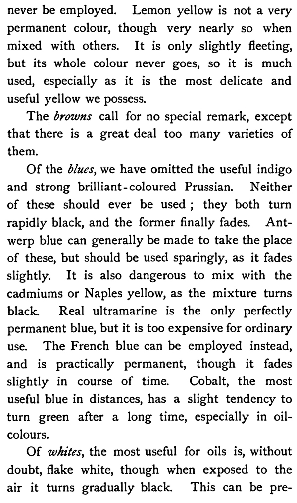 Of whites, the most useful for oils is, without doubt, flake white, though when exposed to the air it turns gradually black. This can be prevented in oil-colours by varnishing, but it is quite useless in water-colours. Zinc white is the only perfectly permanent white, but it is so thin that it is very difficult to handle. The densest is made by Windsor and Newton, but even then it is unpleasant to paint with. Chinese white, the water-colour preparation of the same material, is most useful, and it is quite safe when properly employed. Bismuth white is scarcely ever used.