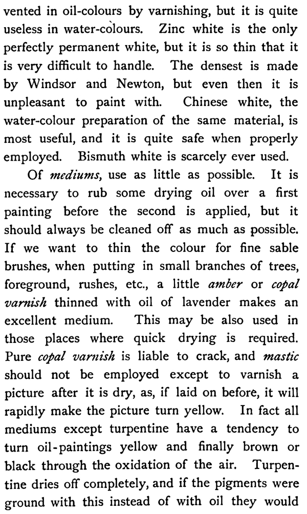Of mediums, use as little as possible. It is necessary to rub some drying oil over a first painting before the second is applied, but it should always be cleaned off as much as possible. If we want to thin the colour for fine sable brushes, when putting in small branches of trees, foreground, rushes, etc., a little amber or copal varnish thinned with oil of lavender makes an excellent medium. This may be also used in those places where quick drying is required. Pure copal varnish is liable to crack, and mastic should not be employed except to varnish a picture after it is dry, as, if laid on before, it will rapidly make the picture turn yellow. In fact all mediums except turpentine have a tendency to turn oil-paintings yellow and finally brown or black through the oxidation of the air. Turpentine dries off completely, and if the pigments were ground with this instead of with oil they would be permanent in colour, but would have no cohesive strength. It has also the disadvantage of bringing the different pigments when mixed into such close juxtaposition that chemical action is set up, and the colours alter or destroy each other. The same pigments, when mixed with linseed oil, have no tendency to act in this way. The object of varnishing is to keep out the air, as it is the active agent of destruction. This is best done about a year after painting, when the picture is dry, first covering it over with a very thin coating of copal varnish. In about a week cover again thickly with mastic. The copal will not crack when thus protected from the air. When the mastic is dirty or yellowed it can easily be cleaned off with spirit, the thin film of copal completely protecting the picture from being cleaned away in the process.