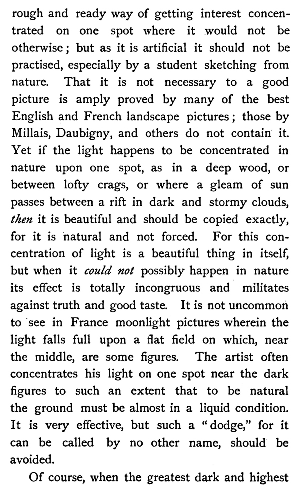 French artists, with whom the writer has expostulated upon its great prevalence in their school, admitted freely that it was not in nature, but argued that it was necessary for a picture that it should be so arranged. It is a rough and ready way of getting interest concentrated on one spot where it would not be otherwise ; but as it is artificial it should not be practised, especially by a student sketching from nature. That it is not necessary to a good picture is amply proved by many of the best English and French landscape pictures ; those by Millais, Daubigny, and others do not contain it. Yet if the light happens to be concentrated in nature upon one spot, as in a deep wood, or between lofty crags, or where a gleam of sun passes between a rift in dark and stormy clouds, then it is beautiful and should be copied exactly, for it is natural and not forced. For this concentration of light is a beautiful thing in itself, but when it could not possibly happen in nature its effect is totally incongruous and militates against truth and good taste. It is not uncommon to see in France moonlight pictures wherein the light falls full upon a flat field on which, near the middle, are some figures. The artist often concentrates his light on one spot near the dark figures to such an extent that to be natural the ground must be almost in a liquid condition. It is very effective, but such a " dodge," for it can be called by no other name, should be avoided.