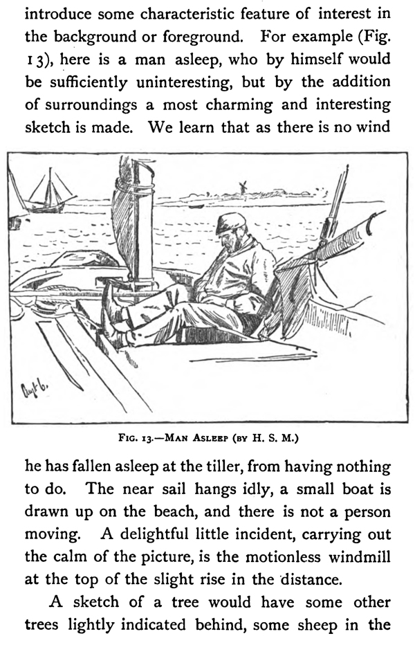 In all compositions there should be one chief point of interest. If it be large there is no limit to the number of subsidiary points of interest, graduating from the principal one down to those that are of very small value. In a sketch it is advisable not to put too many points of interest, especially for a beginner, yet he should always have more than one. This may be taken as marking the difference between a study and a sketch, for in a study the only thing aimed at is to do some particular thing with the utmost realism. The study of a figure will be of the figure alone, but a pleasing sketch of the same will introduce some characteristic feature of interest in the background or foreground. For example (Fig. 13), here is a man asleep, who by himself would be sufficiently uninteresting, but by the addition of surroundings a most charming and interesting sketch is made. We learn that as there is no wind he has fallen asleep at the tiller, from having nothing to do. The near sail hangs idly, a small boat is drawn up on the beach, and there is not a person moving. A delightful little incident, carrying out the calm of the picture, is the motionless windmill at the top of the slight rise in the distance.