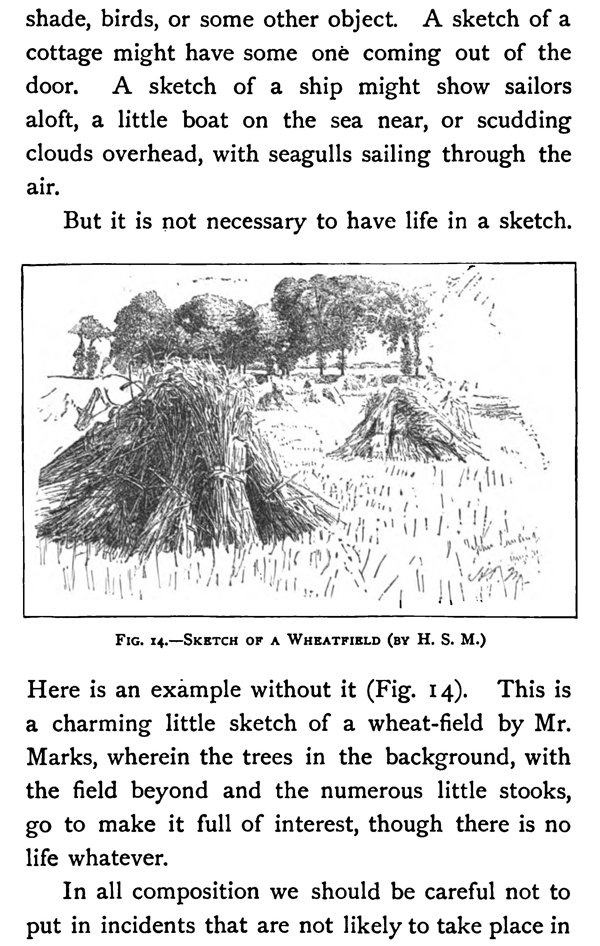 Here is an example without it (Fig. 14). This is a charming little sketch of a wheat-field by Mr. Marks, wherein the trees in the background, with the field beyond and the numerous little stooks, go to make it full of interest, though there is no life whatever.
