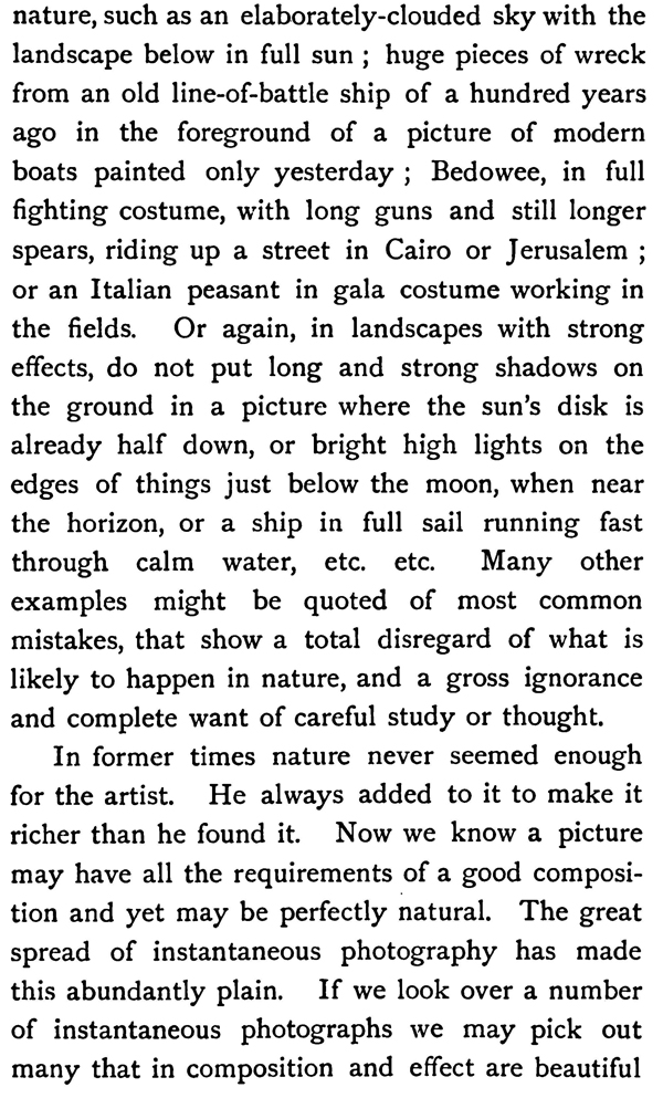 In all composition we should be careful not to put in incidents that are not likely to take place in nature, such as an elaborately-clouded sky with the landscape below in full sun ; huge pieces of wreck from an old line-of-battle ship of a hundred years ago in the foreground of a picture of modern boats painted only yesterday ; Bedowee, in full fighting costume, with long guns and still longer spears, riding up a street in Cairo or Jerusalem ; or an Italian peasant in gala costume working in the fields. Or again, in landscapes with strong effects, do not put long and strong shadows on the ground in a picture where the sun's disk is already half down, or bright high lights on the edges of things just below the moon, when near the horizon, or a ship in full sail running fast through calm water, etc. etc. Many other examples might be quoted of most common mistakes, that show a total disregard of what is likely to happen in nature, and a gross ignorance and complete want of careful study or thought.