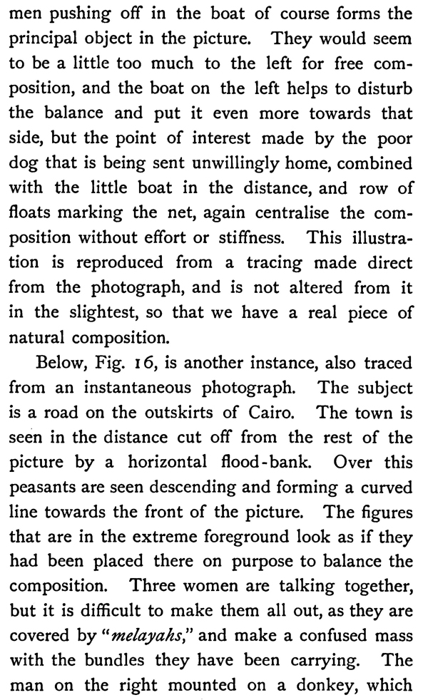 Below, Fig. 16, is another instance, also traced from an instantaneous photograph. The subject is a road on the outskirts of Cairo. The town is seen in the distance cut off from the rest of the picture by a horizontal flood-bank. Over this peasants are seen descending and forming a curved line towards the front of the picture. The figures that are in the extreme foreground look as if they had been placed there on purpose to balance the composition. Three women are talking together, but it is difficult to make them all out, as they are covered by "melayahs," and make a confused mass with the bundles they have been carrying. The man on the right mounted on a donkey, which turns its head to look at the women, completes the composition in an unconventional manner.