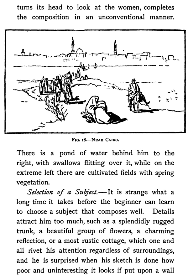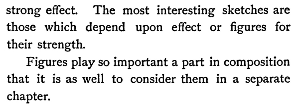 To choose a subject well, you should perpetually think of how it will compose in your sketch either with or without the accessories of figures or strong effect. The most interesting sketches are those which depend upon effect or figures for their strength.
