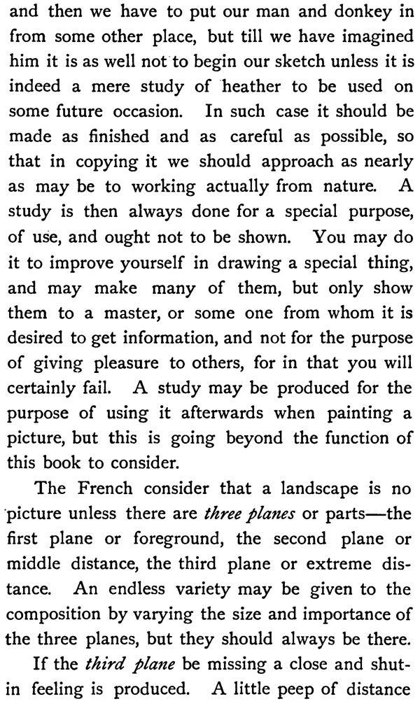 The French consider that a landscape is no picture unless there are three planes or parts—the first plane or foreground, the second plane or middle distance, the third plane or extreme distance. An endless variety may be given to the composition by varying the size and importance of the three planes, but they should always be there.
