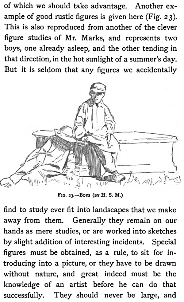 of which we should take advantage. Another example of good rustic figures is given here (Fig. 23). This is also reproduced from another of the clever figure studies of Mr. Marks, and represents two boys, one already asleep, and the other tending in that direction, in the hot sunlight of a summer's day. But it is seldom that any figures we accidentally find to study ever fit into landscapes that we make away from them. Generally they remain on our hands as mere studies, or are worked into sketches by slight addition of interesting incidents. Special figures must be obtained, as a rule, to sit for introducing into a picture, or they have to be drawn without nature, and great indeed must be the knowledge of an artist before he can do that successfully. They should never be large, and should be more blocked in than drawn in. Animals, again, are even more difficult than figures, and should only be introduced after a great deal of individual study.