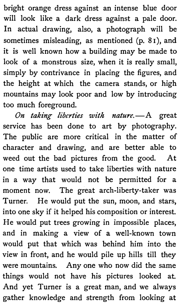 Again, a bright orange dress against an intense blue door will look like a dark dress against a pale door. In actual drawing, also, a photograph will be sometimes misleading, as mentioned (p. 8 I), and it is well known how a building may be made to look of a monstrous size, when it is really small, simply by contrivance in placing the figures, and the height at which the camera stands, or high mountains may look poor and low by introducing too much foreground.