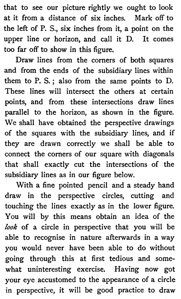 If our eyes were sufficiently accurate we should only have to place our picture upright beside the subject to be drawn, shut one eye, and copy exactly from nature, in order to get a representation in perfect perspective. The writer has known such a draughtsman who, without any knowledge of perspective, yet drew Nature correctly. He could see with only one eye, and therefore had seen, as it were, a picture always before him, for all our drawings are but the representation of what we see with one eye.